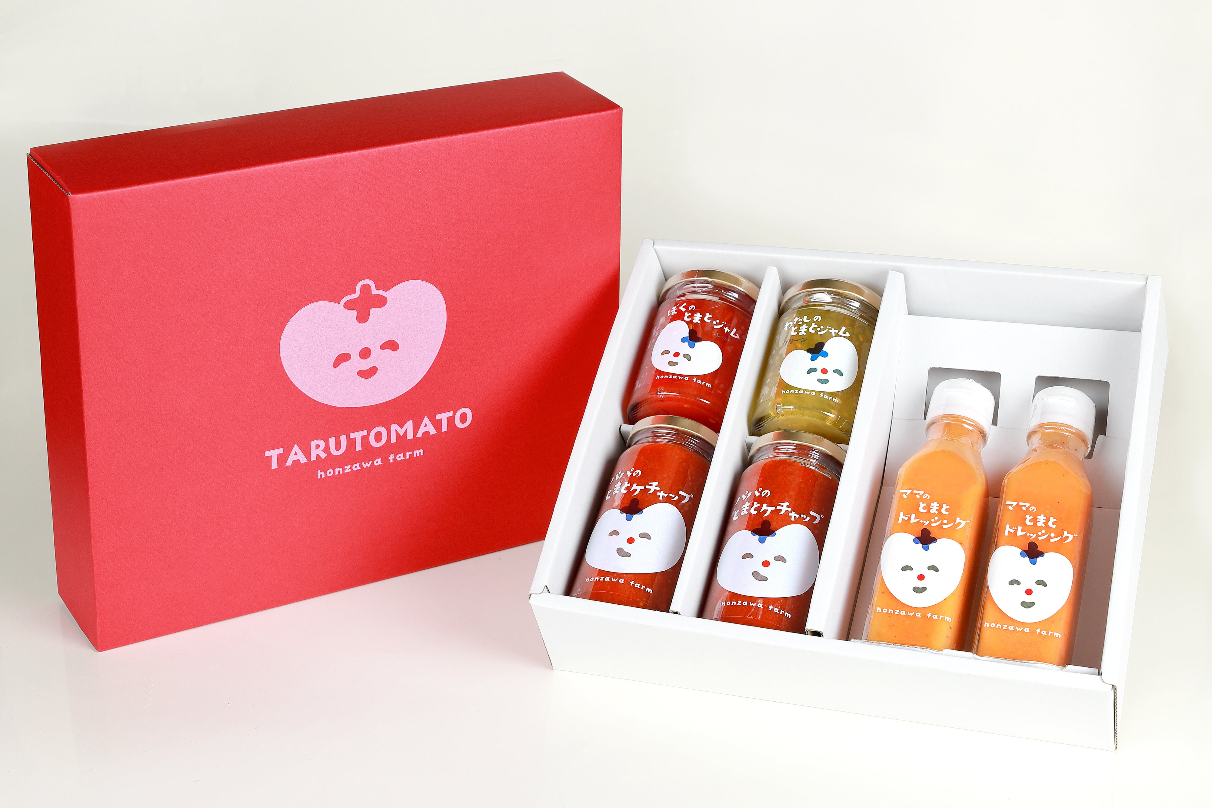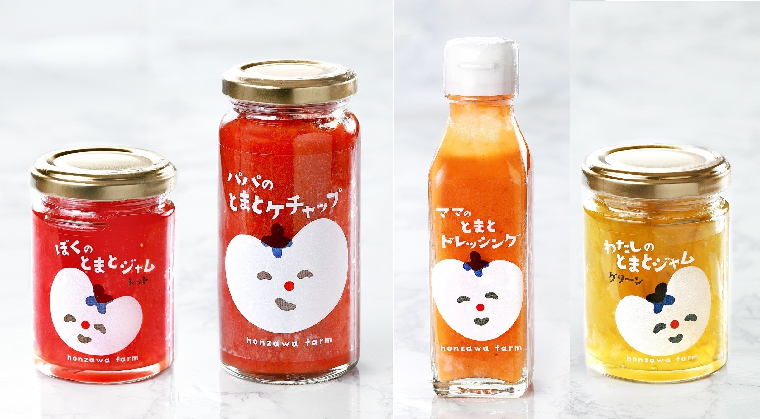 ほんざわ農園の商品開発コンセプトは、こどもたちが安心して笑顔で食べられる商品づくりです。上の写真のように、「パパのとまとケチャップ」や「ママのとまとドレッシング」、「ぼく、わたしのとまとジャム」など、ファミリー向けの親しみやすいパッケージでとても可愛らしいと評判です(笑)