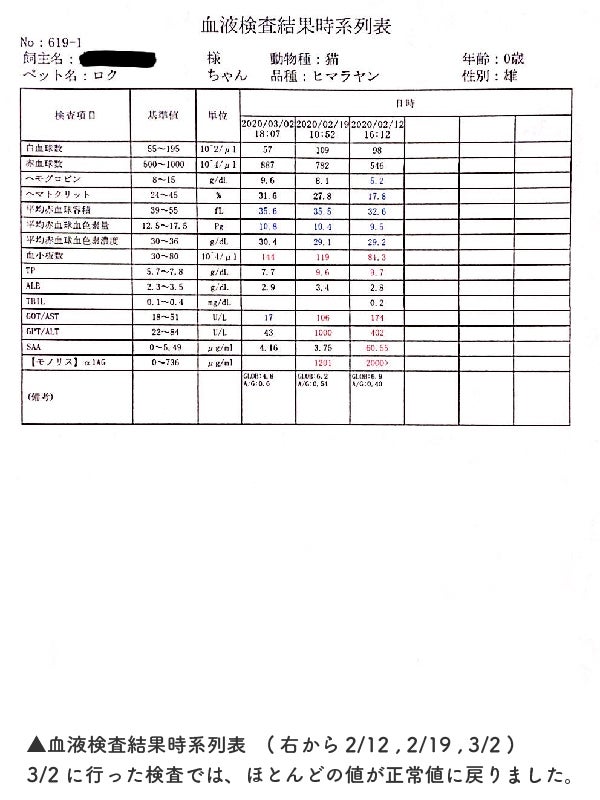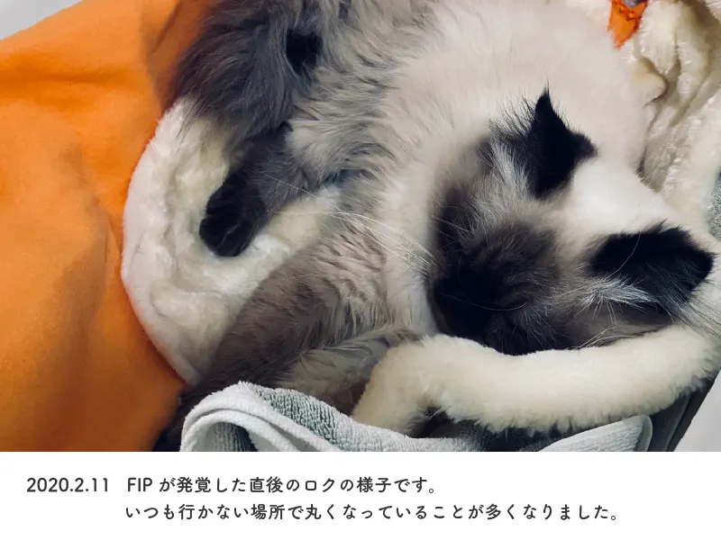 しかし、そんなロクが少しずつ元気がなくなってきた、、と心配していた1月。血液検査をした際、放っておくと短期間で死に至る病「FIP(猫伝染性腹膜炎)」にかかっていることが発覚しました。