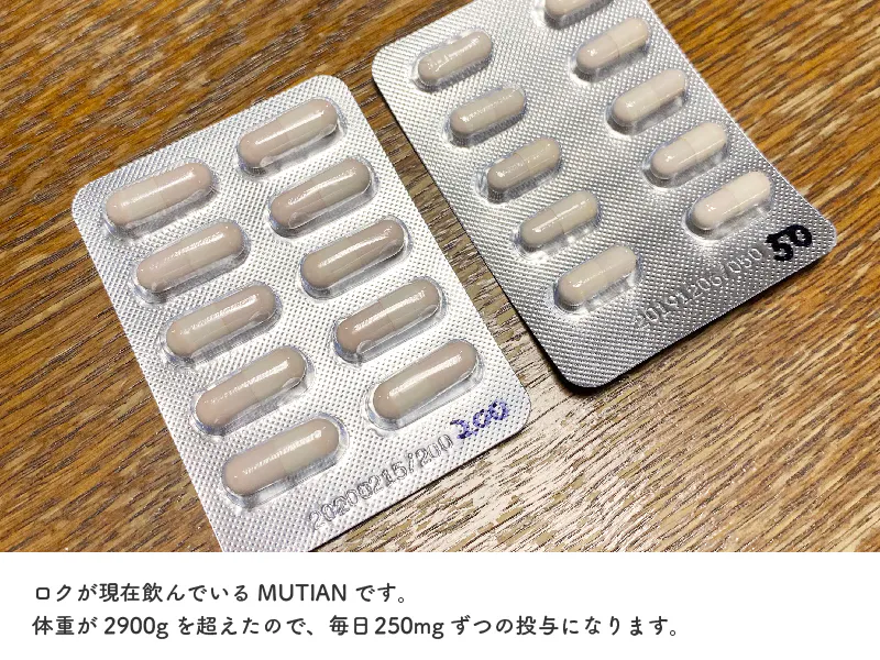 2020/05/10 13:36こんにちは!ご支援をいただいているみなさまありがとうございます!5月5日、84日間のMUTIANの投与が終了しました。最初は一つMUTIANをあげるだけでも一苦労で、これを三ヶ月近くも続けるのか、、と思ったことを覚えています。しかし、日に日に元気になっていくロクの姿やCAMPFIREを通してたくさんの方にご支援を頂いたことに励まされながら、84日間を無事に終了することが出来ました。ありがとうございました。病院の先生にも連絡を頂き、4月30日の検査結果も問題なかったと言われました!この後、3ヶ月の経過観察があります。まずは、1ヶ月後に病院に行くまで元気さと食欲をよく見ておいてくださいと言われています。ロクが健やかに元気に過ごせるように引き続きしっかりお世話をしていきます^^みなさまもご健康にお気をつけてお過ごしください。p.s. 写真はロクがMUTIAN投与を無事に終了した時に撮ろうととっておいたMUTIANの包装シートです。たくさん頑張りました! もっと見る【支援者様向け活動報告】MUTIAN費内訳について③
