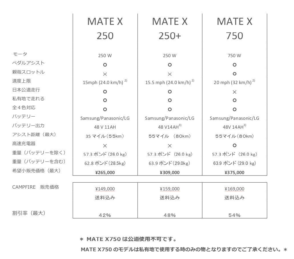 250 Wモーター搭載のMATE X 250と250+は、日本規格のJIS D9115 に従い、最高速度が15.5 mph (24km/h) に初期設定されています。そのため、モーターによるアシスト速度は24km/hが上限となります。