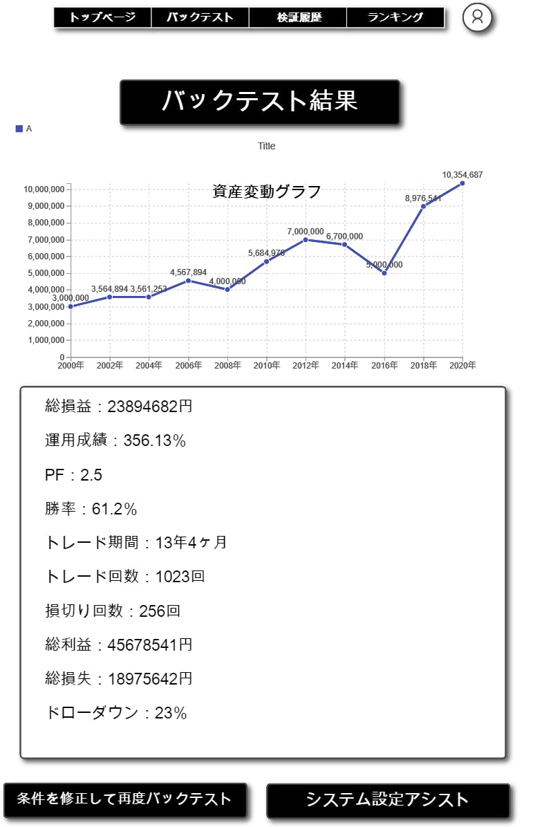 WEBサイト上で、自身でどの様な手法にするか決定してもらい、その手法の性能を過去数十年のデータに基づいて、トレードしていたら?という検証(バックテスト)を行い、その成績を出力できるシステムをWEBサイト上で行えるようにすることです。