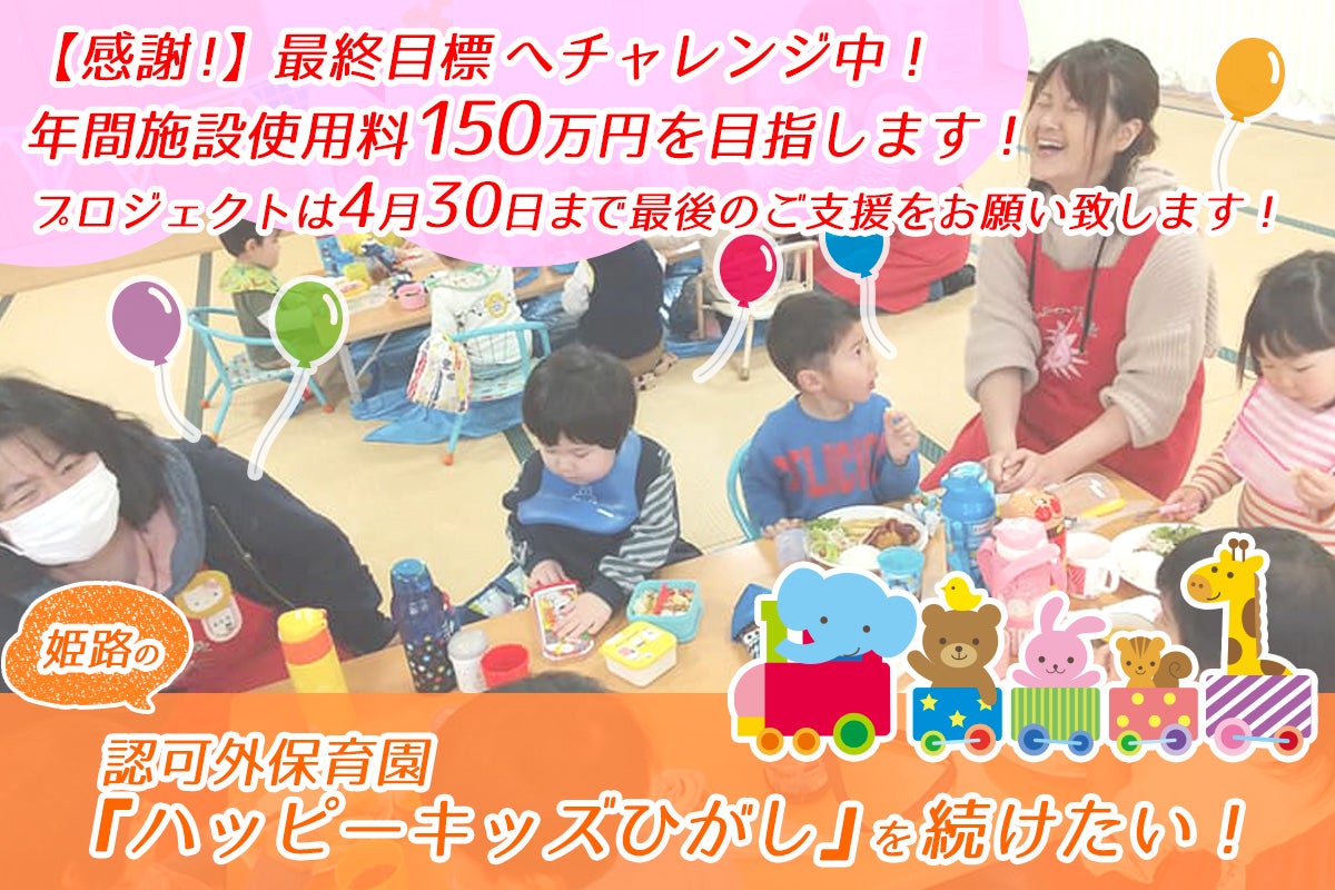 2020/05/01 11:08姫路の認可外保育園『ハッピーキッズひがし』を続けたい!クラウドファンディング・プロジェクトへのご協力、本当にありがとうございました。プロジェクト終了の報告とお礼をさせて頂きます。皆様のあたたかいご支援と応援で、第1目標(15万円)の541%を達成することができました。最終 ご支援者数:136人 支援総額:812,400円代理決済で複数人まとめてさせて頂いていますので、150人くらいの方々にご支援いただいています。※詳細はこちらからご覧いただけます。https://camp-fire.jp/projects/view/235659順次、リターン品の準備をしていきます。クラウドファンディングをおこなって、いろいろなことを学びました。●ご支援、応援してもらおうと思ったら、まず、自分を、自分たちの活動を知ってもらうことが必要。●いかに自分を、自分たちの活動をアピールすることができるか●どんなに素晴らしいことをしていても、それを広く、多くの人に知ってもらえなければ、埋もれてしまう●自分の信じたことを、信念をもって、やり続けること皆様のご支援、応援、本当にありがとうございました。プロジェクトは終わりましたが、ハッピーキッズひがしの活動は、続いています。これからも、自分たちの信じたことを、精一杯やっていきたいと思っています。☆園児募集しています。 毎日でなくても、週1日とか2日、理由を問わずお預かりします。 ☆現在は、緊急事態による『特別保育』のため、 『どうしても、預けないと困る』方のみのお子様を、 感染予防対策をとりながら、お預かりしています。 他園に在籍の方でも、緊急事態時のみのお預かりも可能です。 お困りの方がいらっしゃいましたら、お問合せ下さい。 http://www.eonet.ne.jp/~happykids/ もっと見るご支援ありがとうございます。クラウドファンディング終了まで、あと30分。最後までご協力お願いいたします。