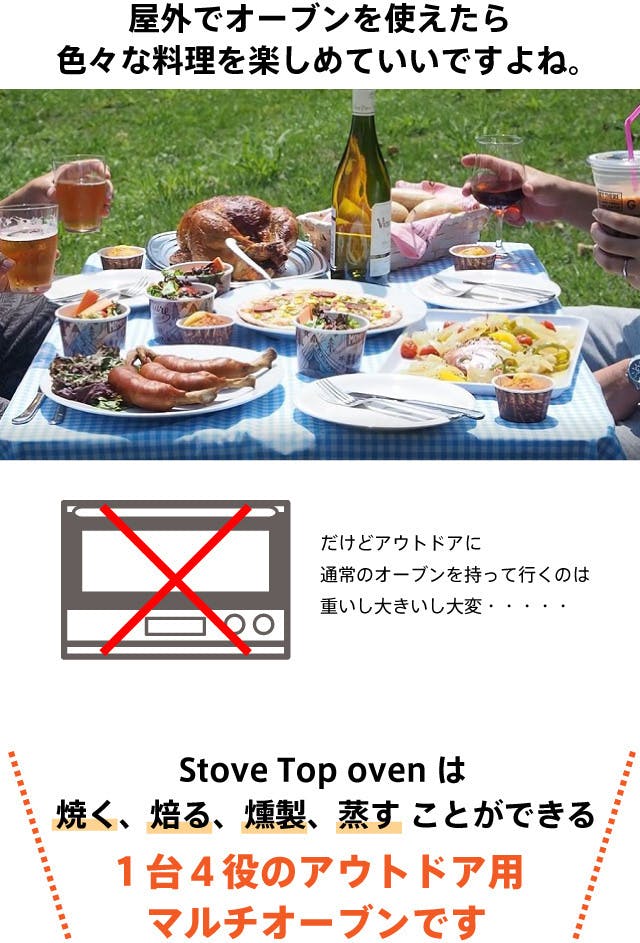 StoveTop ovenは電源不要でオーブン調理が可能。