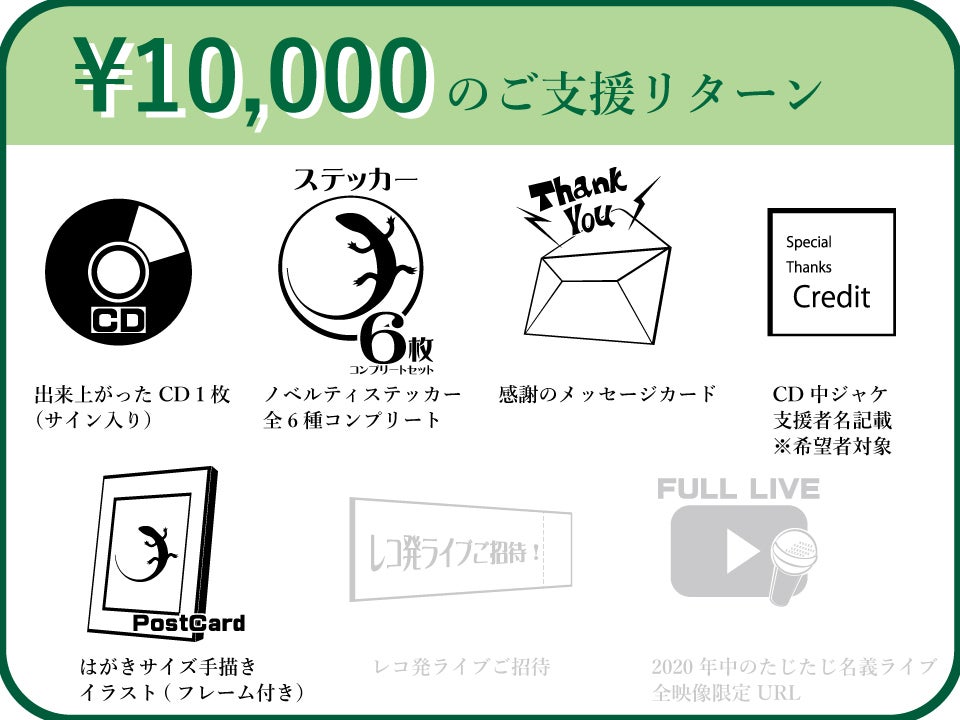自身の爬虫類、両生類への愛が詰まった6曲入りミニアルバム『ヤモリのうた』をリリースしたいのですが、楽曲のアレンジ費、トラック製作費、レコーディング費などが嵩み…この度はプレス代を援助していただきたくクラウドファンディングに踏み切りました。