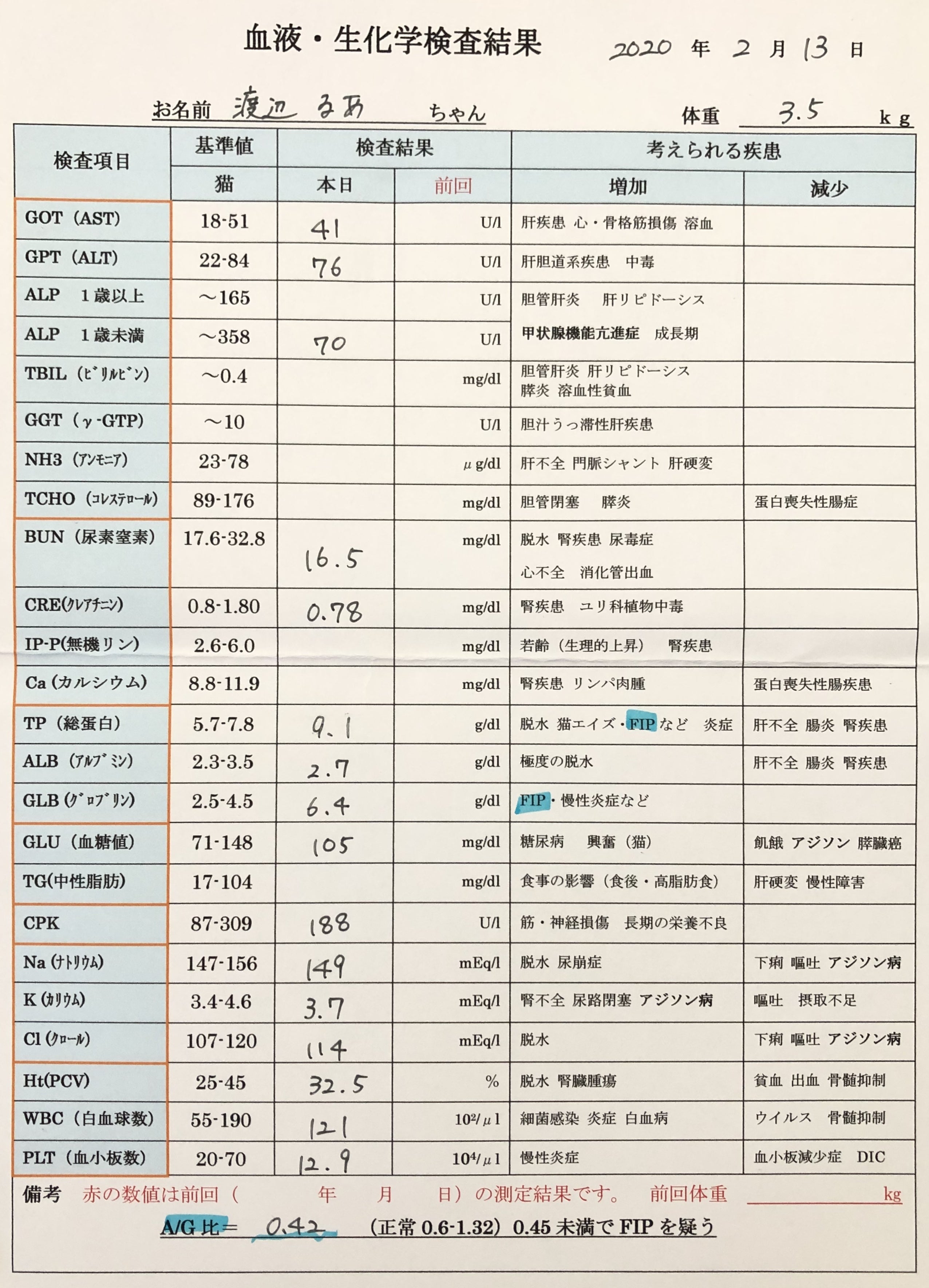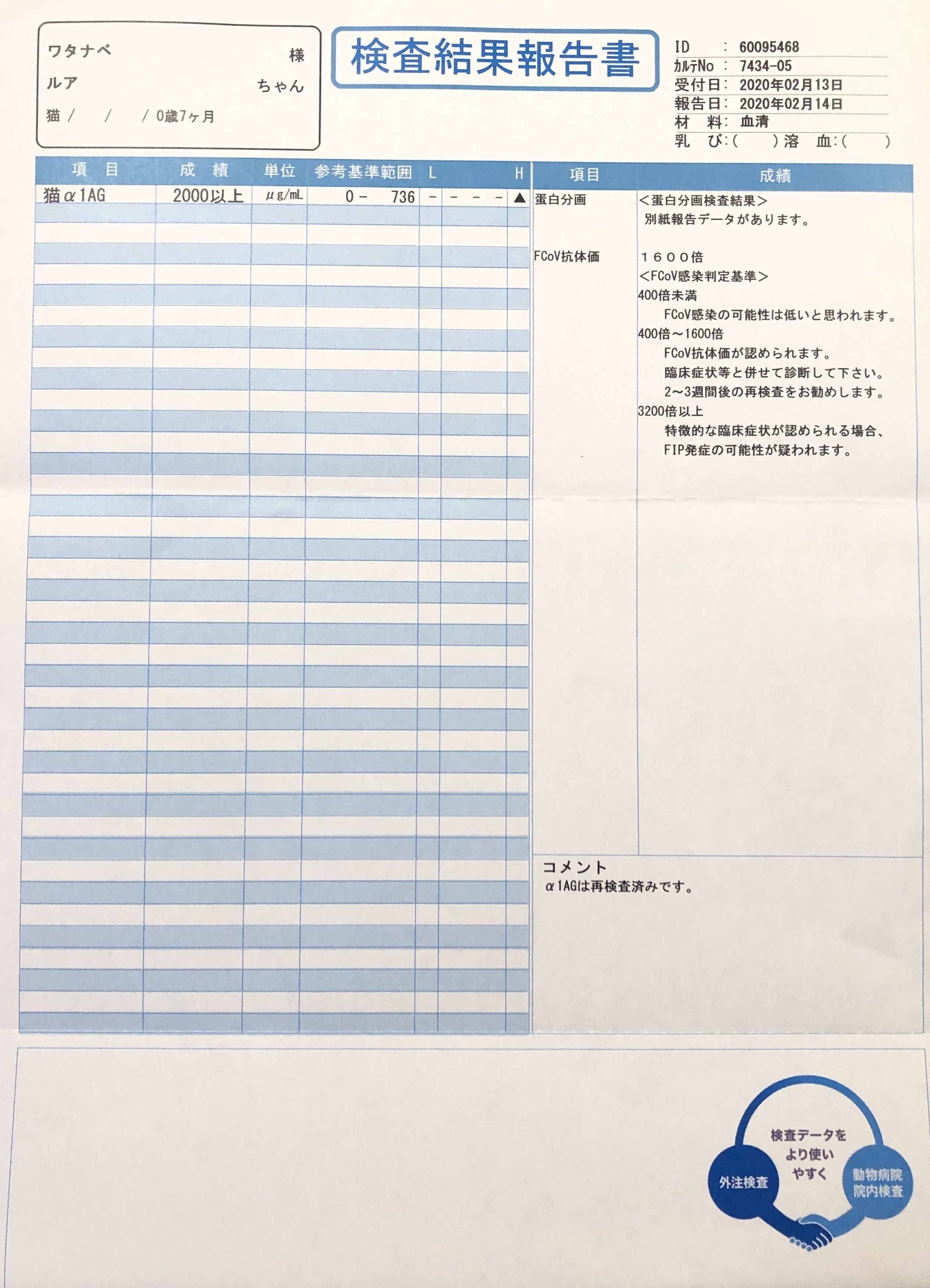 2020/08/31 16:49こんにちは、渡辺です。今回が最後の活動報告の投稿となります。2020年8月12日の支出報告と治療経過▼8月12日経過観察期間最後の血液検査をしました。4,110円 ※保険適用合計 1,152,545円検査結果↓◆蛋白分画検査検査日 2月13日→3月4日→4月1日→4月28日→6月10日→8月12日A/G 0.30 → 0.52 → 0.59 → 0.73 → 0.79 → 0.71TP 8.3 → 9.1 → 7.0 → 6.5 → 6.8 → 7.1ALB 23.0 → 34.1 → 37.1 → 42.1 → 44.0 → 41.6γGLB 48.8 → 39.6 → 37.1 → 30.2 → 30.6 → 31.0◆炎症マーカー 猫α1AG2月13日→3月4日→4月1日→4月28日→6月10日→8月12日2000以上 → 565 → 207 → 151 → 229 → 177今回が最後の検査でした。検査結果も問題なしとのことで、ついに寛解となりました!!るあ、よく頑張りました!元気でいてくれて、本当に嬉しいです!今もるあは食欲旺盛でおもちゃを出すとすぐに駆け寄ってきて遊ぶことが大好きです!とても元気です!そして、たくさんの方に応援して頂き、すごく支えになりました。心から感謝しています。長い間見守って下さった皆さま、本当にありがとうございました。いつか必ず、FIPで辛い思いをする猫ちゃん、飼い主様がいない、そういう世界になりますようにと願っています。渡辺 もっと見るリターンの発送が完了しました。