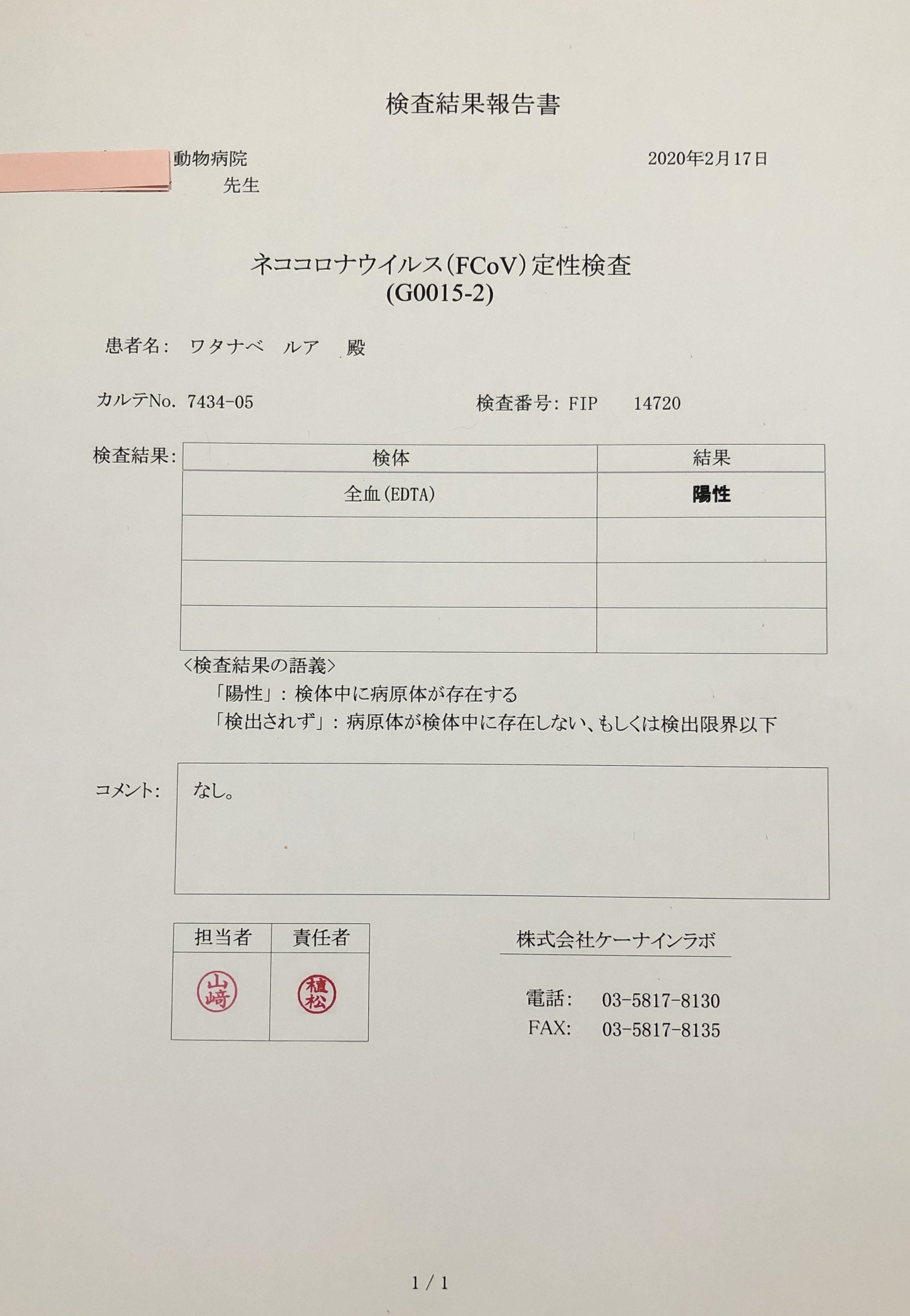 さらに精密検査をして頂き、FIPのドライタイプと診断されました。