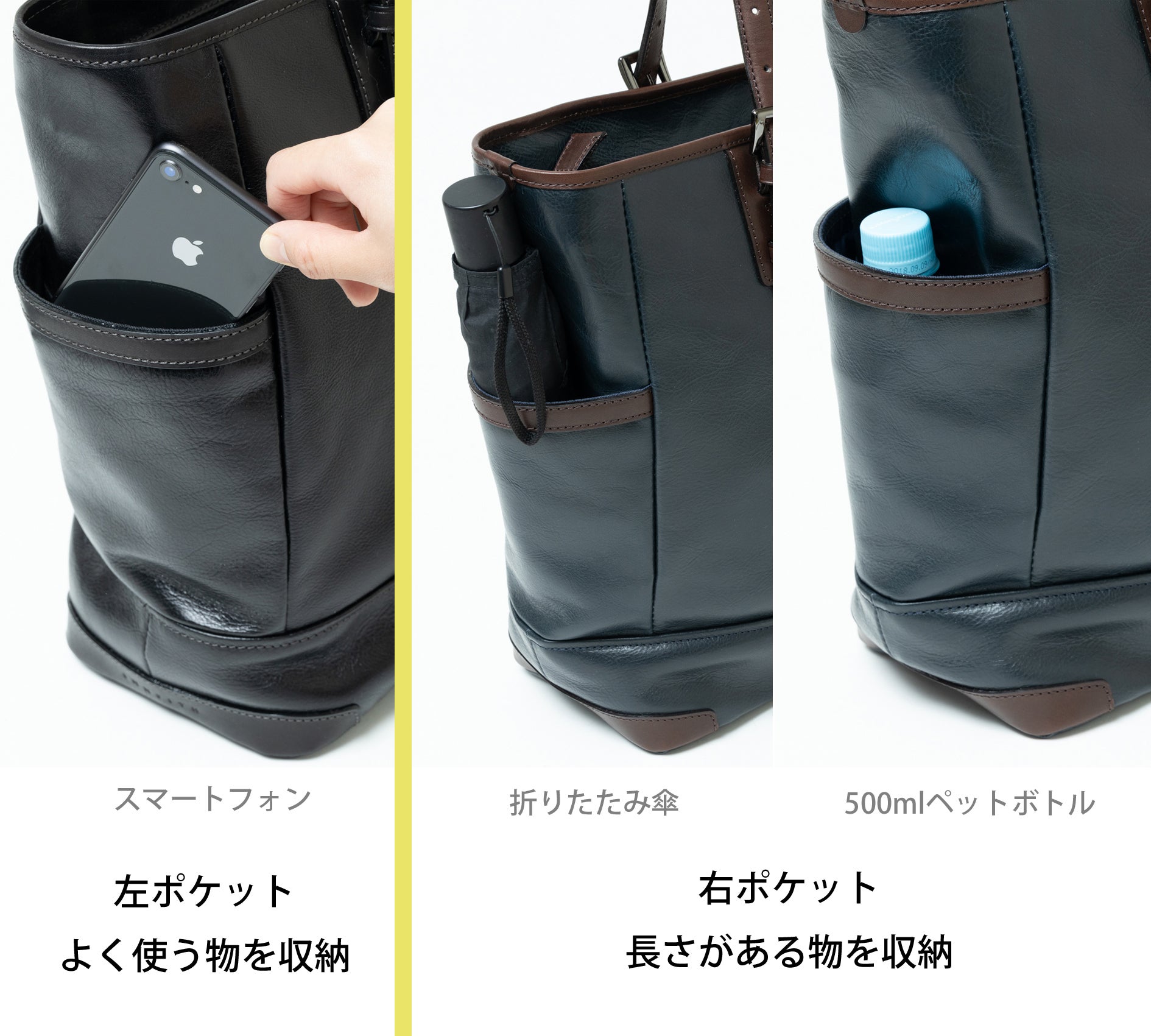 深いポケットには折りたたみ傘や500mlペットボトルなど長さのある物を、