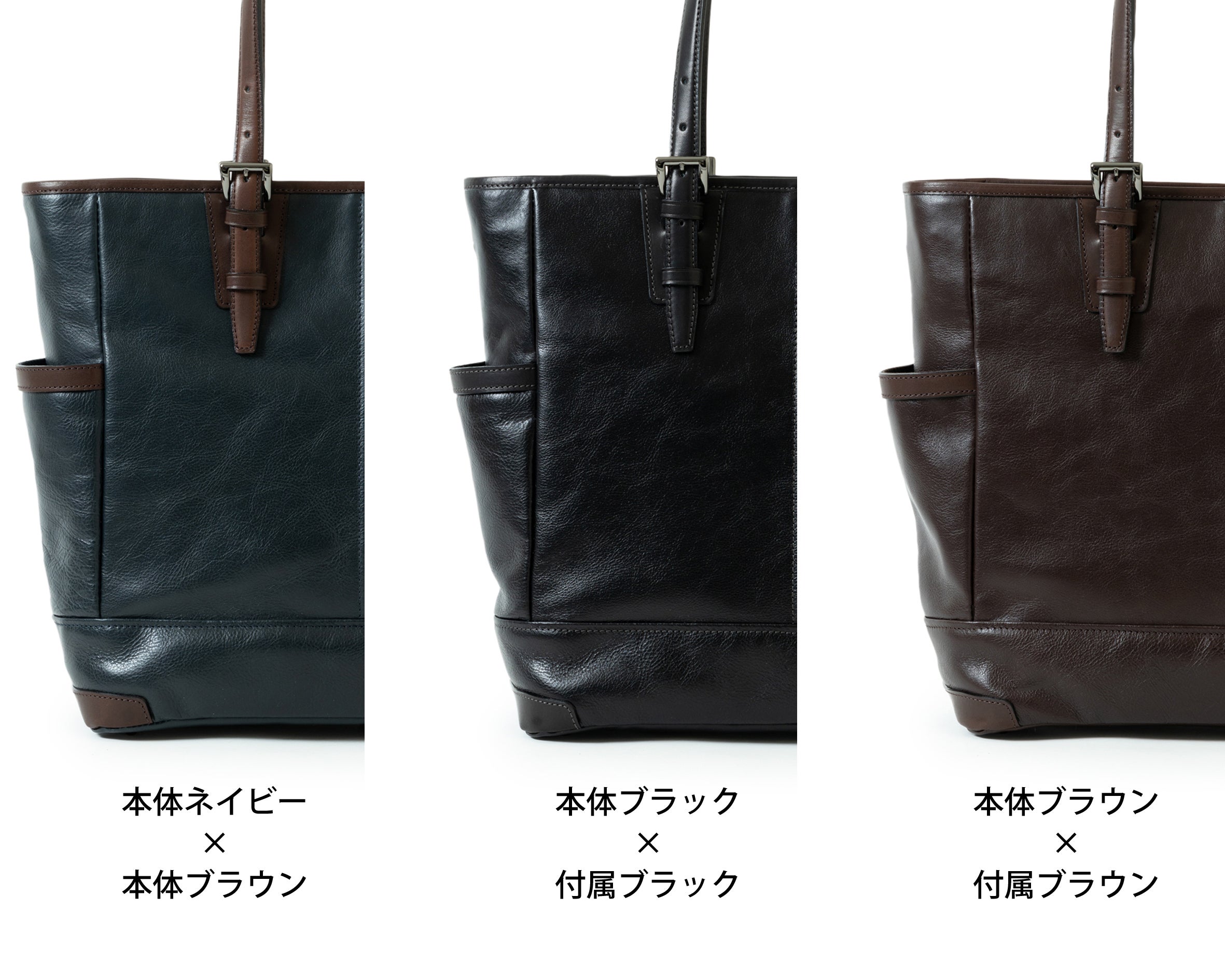 ネイビー:本体紺色に付属の革は茶色となっております。