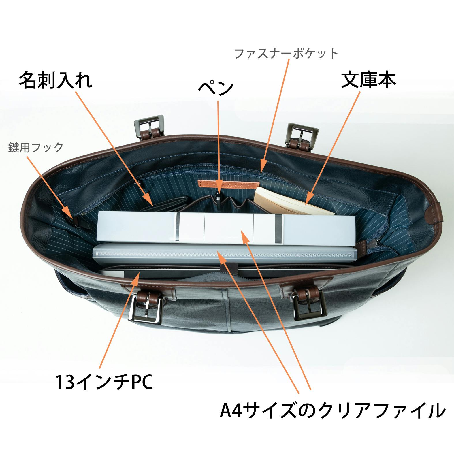 マチをたっぷり取ってあるので、PCはもちろんA4サイズのクリアファイルも簡単に出し入れできます。