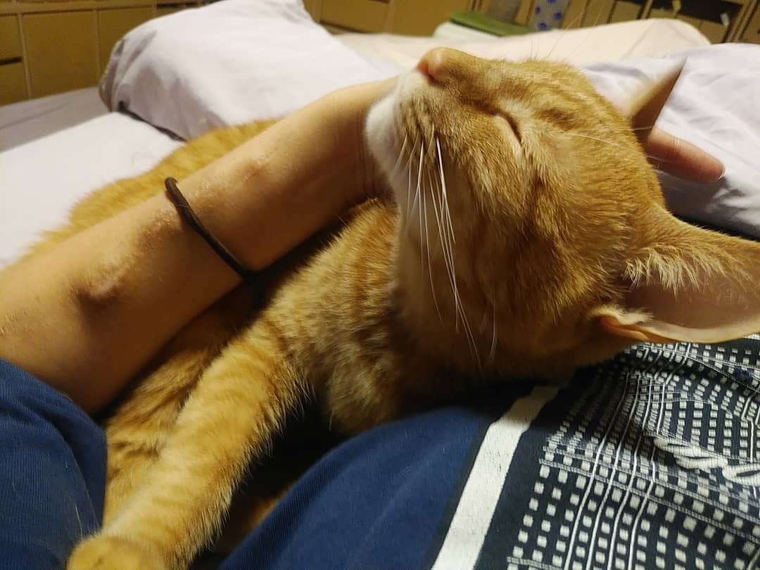 一日中ママのベッドで寝ています。右側のハゲは三つ大きなのがあります。触ると見えないものも沢山あります。ママは、ちょっと体調が悪化してしまいまして、残念ながら、注射につきそう事が難しくなっています。お兄ちゃんが引き続き、大学の入学式や受講がすべて休講な事もあって、頑張ってタクシーで獣医さんまで通ってくれています。獣医さんも代休の先生にもしっかり引き継いで、最後まで頑張って打っていただける体制を毎日用意して下さっています。