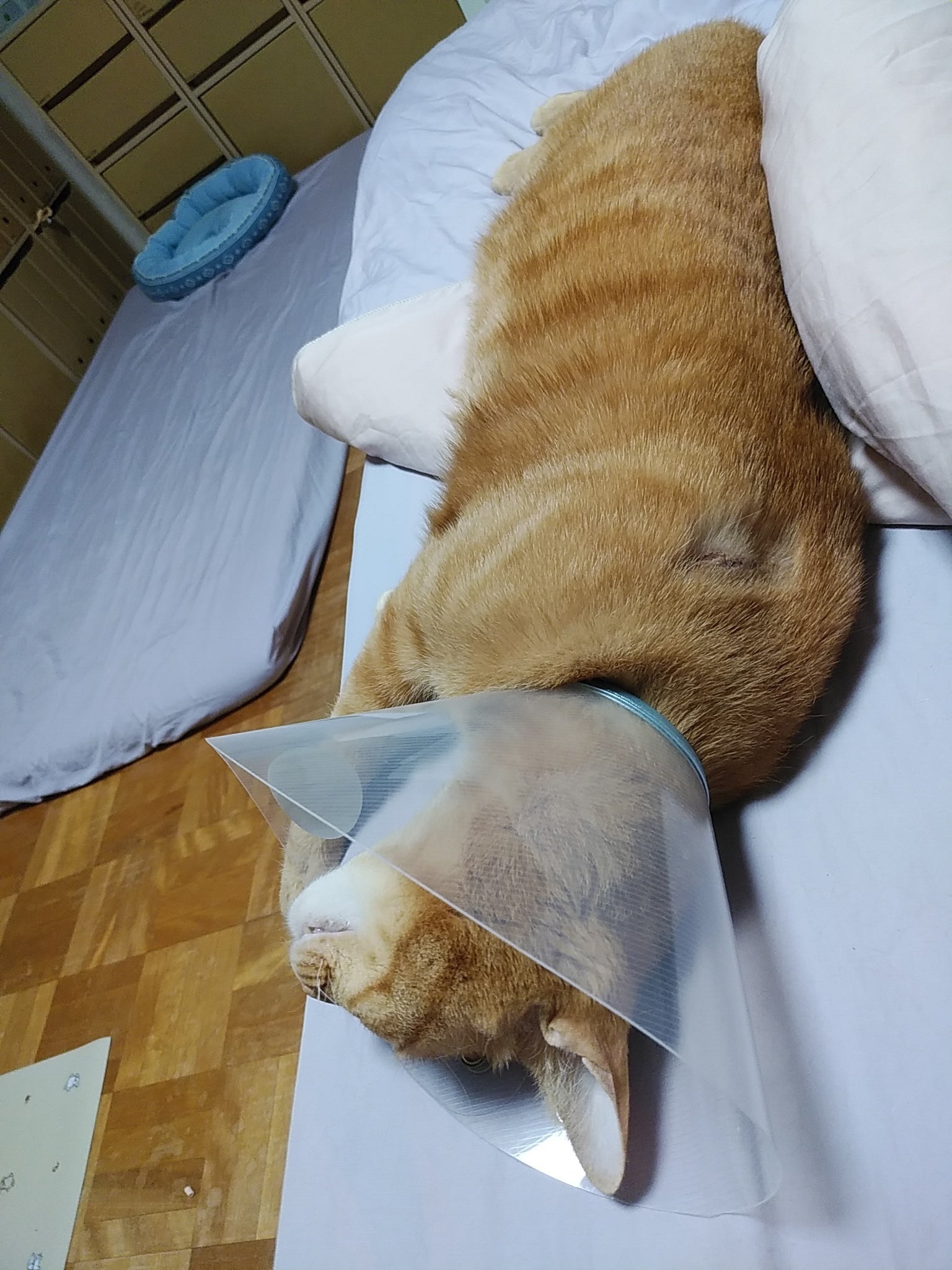Christopher aka Kuri-chan (in Japanese), the orange tabby cat, is one of the three kittens who were abandoned and saved from inside the wall three years ago. I helped them grow until they find new foster homes. Other two of his brothers found their new owner, but while Kuri-chan happened to stay a little longer than the others, he had a mild epileptic seizure at the age of 7-months. That was when we stopped looking for his foster parent and adopted Kuri-chan to ourself.
