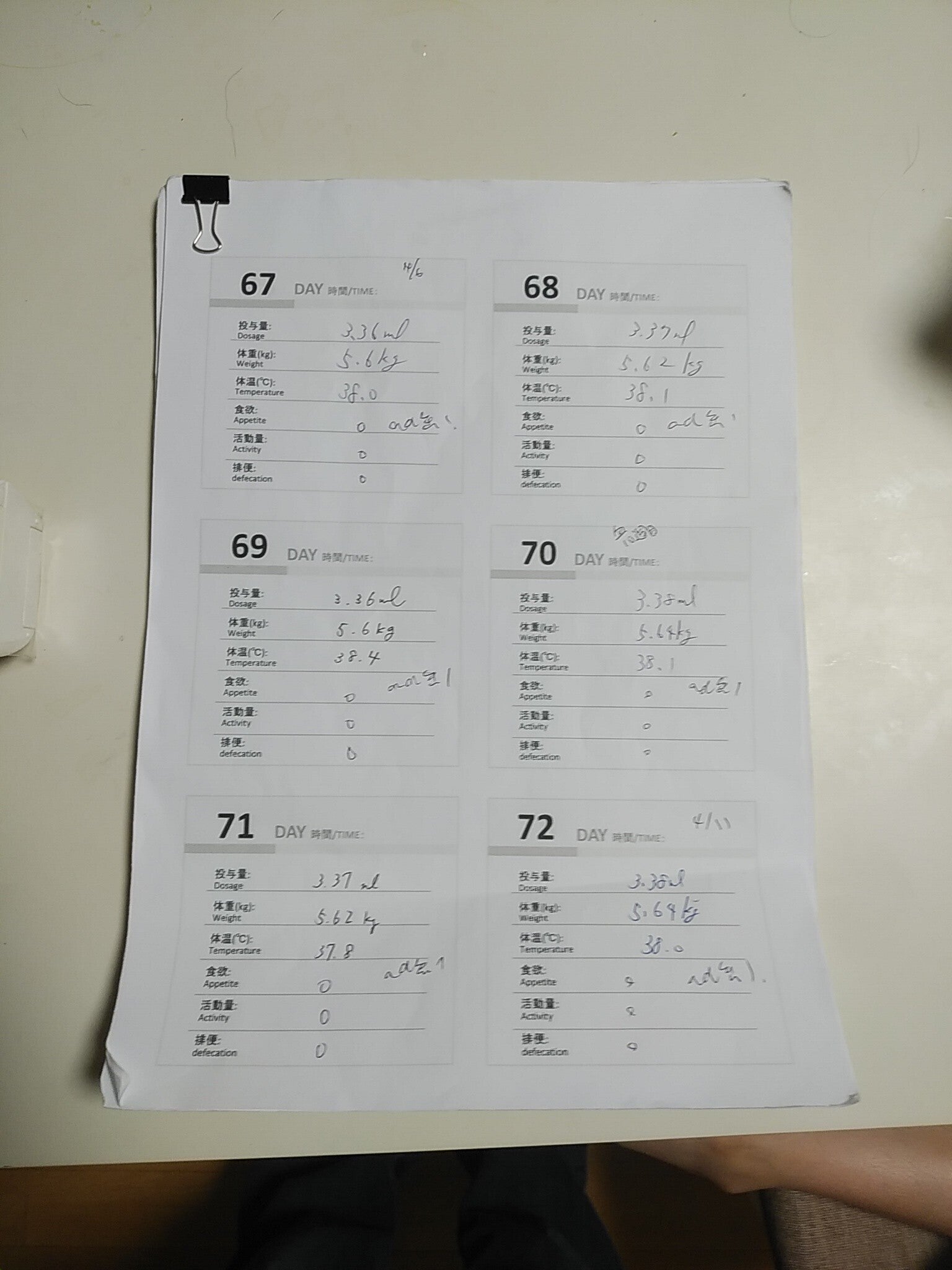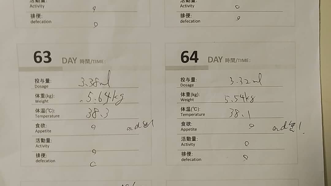 投与量は二倍量継続最後までで、体重増加に伴い3.38ml、約3.4mlに達しました。一瓶5mlで、379ドルです。