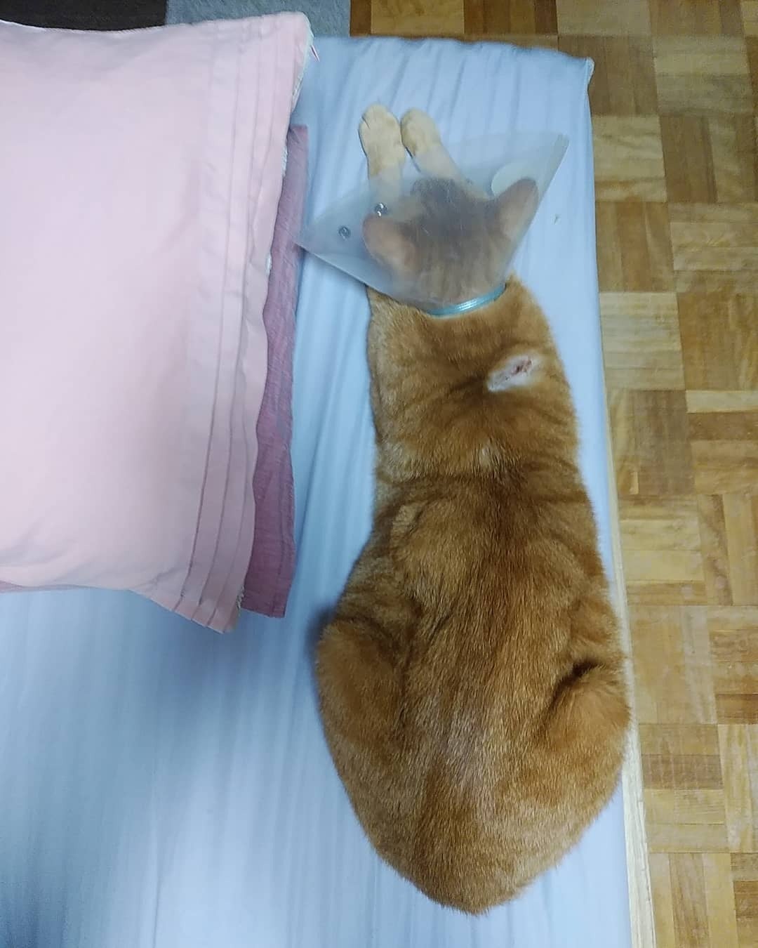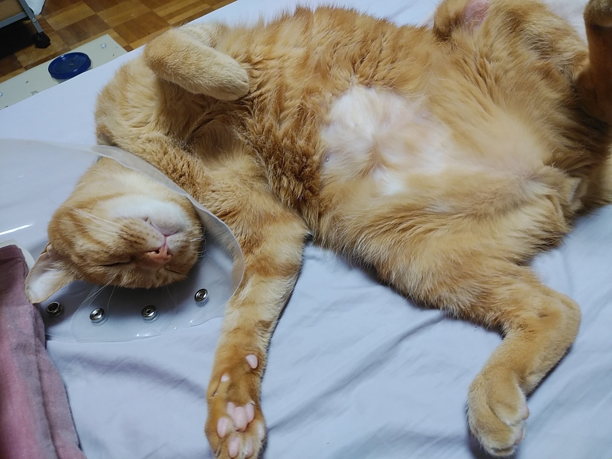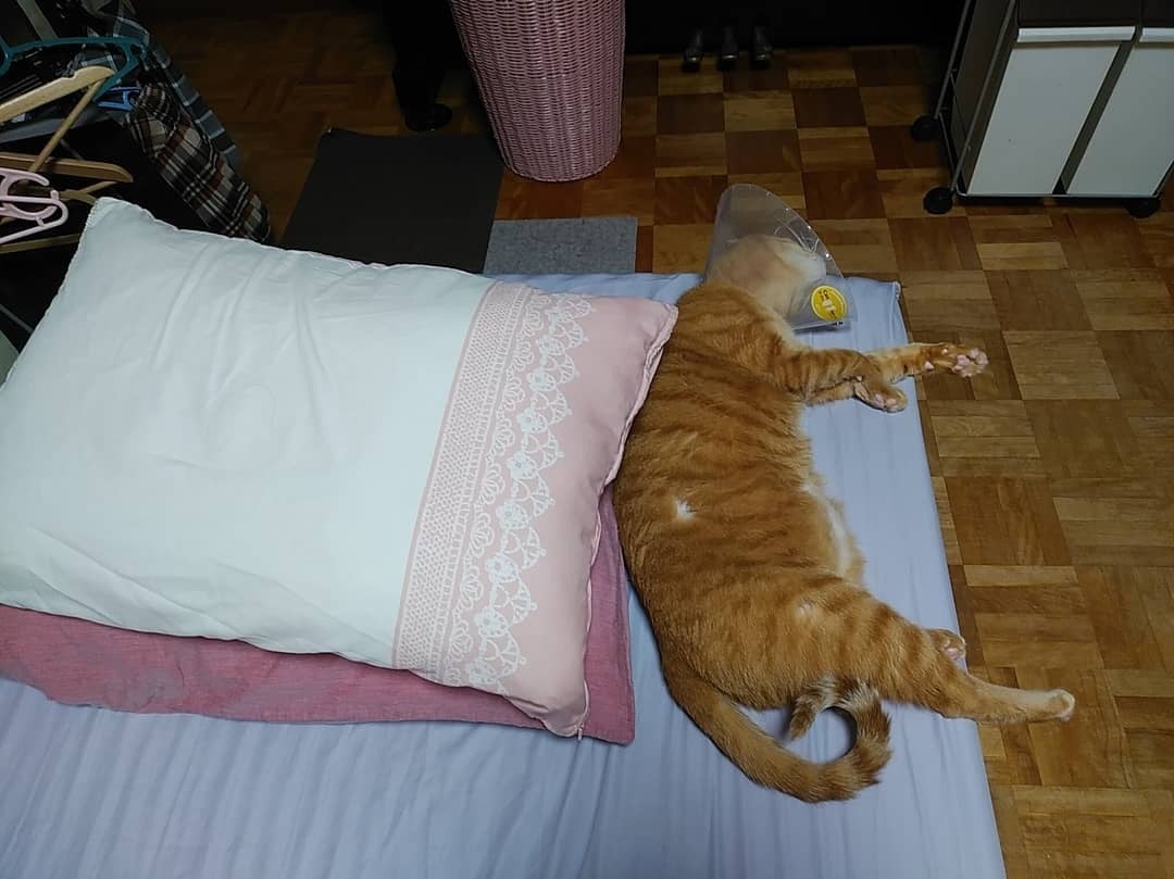 一日中ママのベッドで寝ています。右側のハゲは三つ大きなのがあります。触ると見えないものも沢山あります。ママは、ちょっと体調が悪化してしまいまして、残念ながら、注射につきそう事が難しくなっています。お兄ちゃんが引き続き、大学の入学式や受講がすべて休講な事もあって、頑張ってタクシーで獣医さんまで通ってくれています。獣医さんも代休の先生にもしっかり引き継いで、最後まで頑張って打っていただける体制を毎日用意して下さっています。