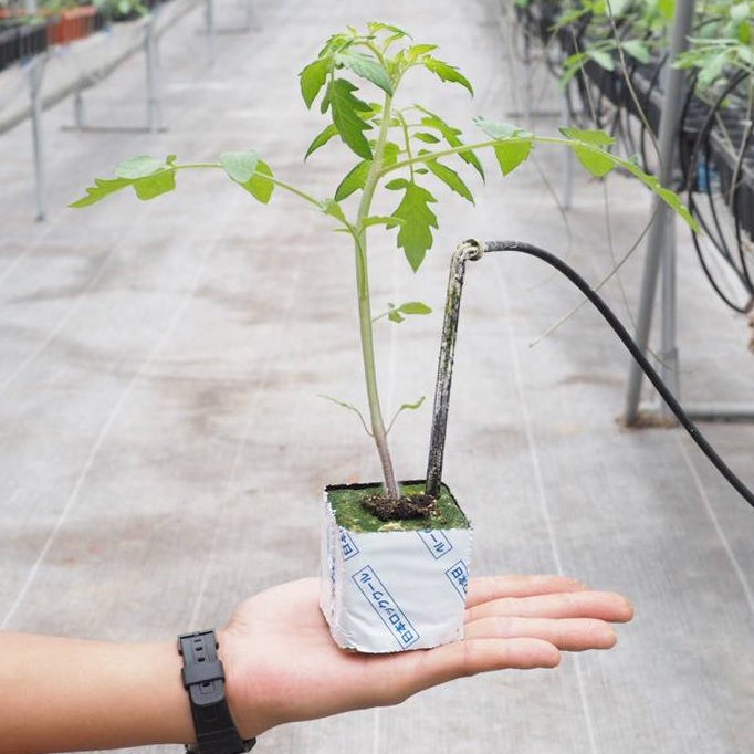ご覧のように、土の代わりに、無機質の工業製品、ロックウールというものを使用します。しかもサイズは6cm四方の極めて小さいものを使っています。「トマトはストレスをかけると甘くなる」ーみなさんも聞いたことがあるかもしれません。実際にそうなんです。水やりの量・頻度を減らして、適切なストレスを与えることがトマトの品質を左右する要因の一つです。土を使用した栽培では「匠の技」だったストレスのコントロールを、小さいロックウールで栽培することで容易なものにしました。