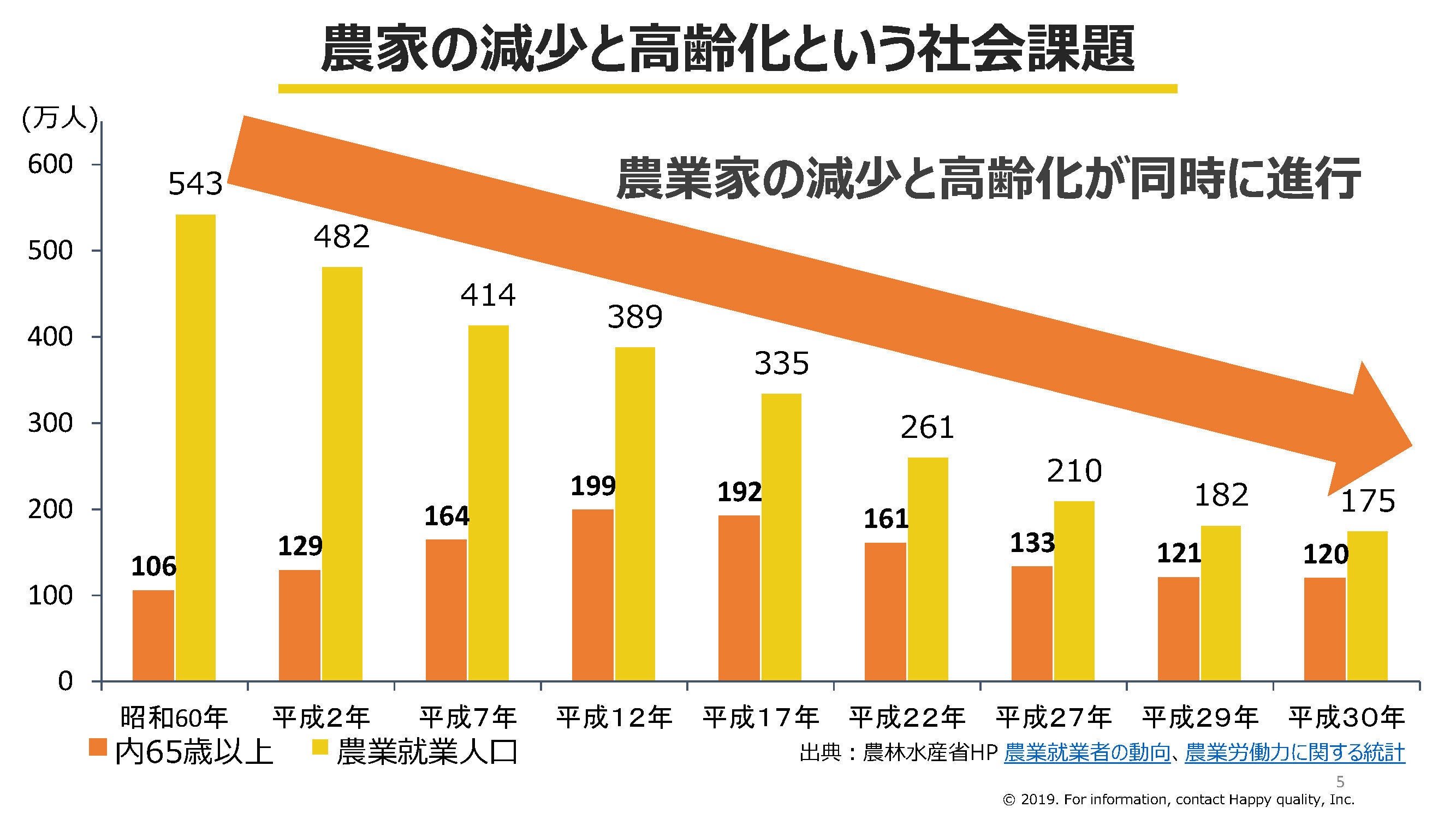 農業就業人口は、全盛期と比較して約7割減少し、同時に高齢化も進行しているんです。