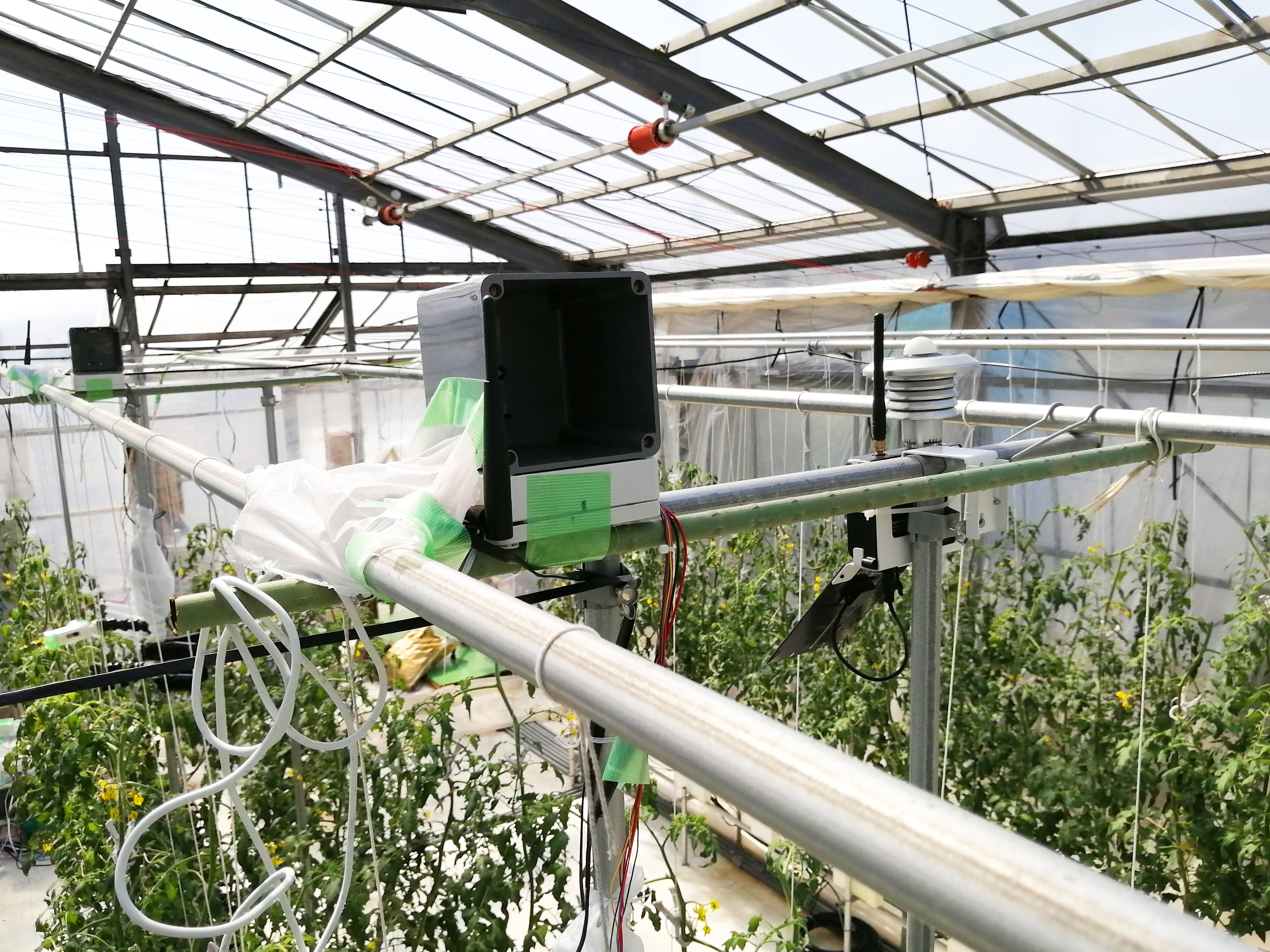 こちらは温度・湿度・光の強さを測る機器です。これらの器機から収集したデータを基に、AIがしおれるタイミングを予想し、しおれ「そう」というタイミングで水やりを行なっていきます。それにより、適切なストレス管理をして、おいしいトマトをより安定的に作ることができるようになります。