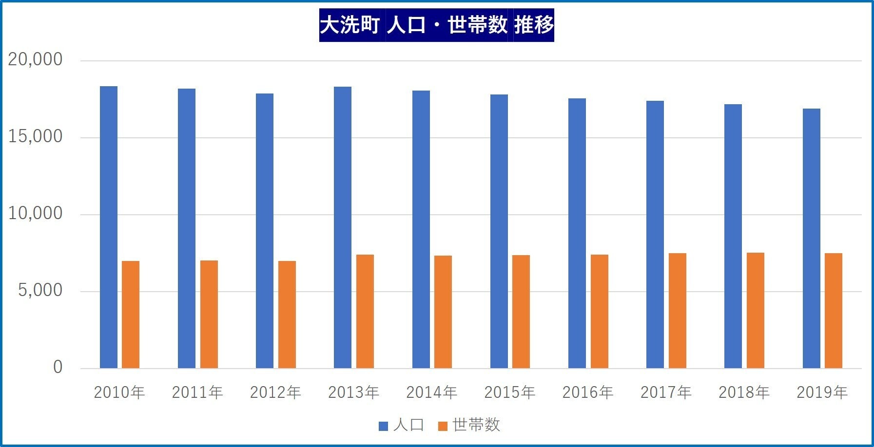 大洗町 人口推移(単位:人)ここ数年「世帯数」は若干伸びているものの、人口は今後も緩やかに減少すると予想されます。