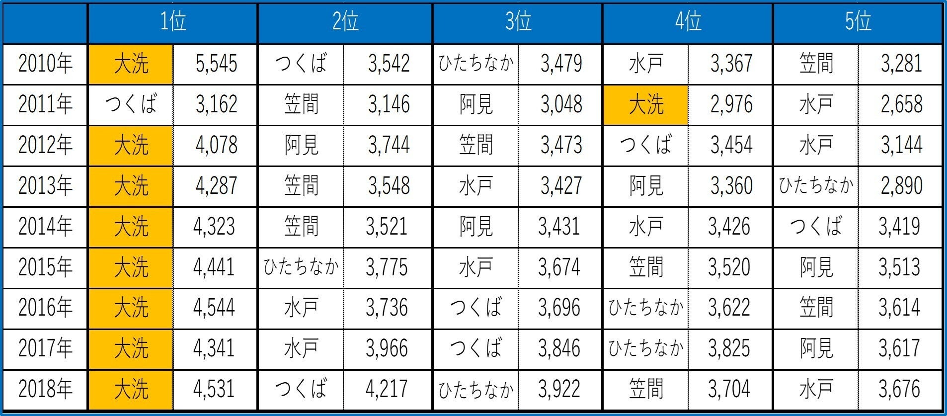 茨城県観光客動態調査結果(単位:千人)県内の観光客数では近年も1位をキープし続けていますが、横ばいです。観光の街として、継続した観光事業への投資の必要性を感じます。