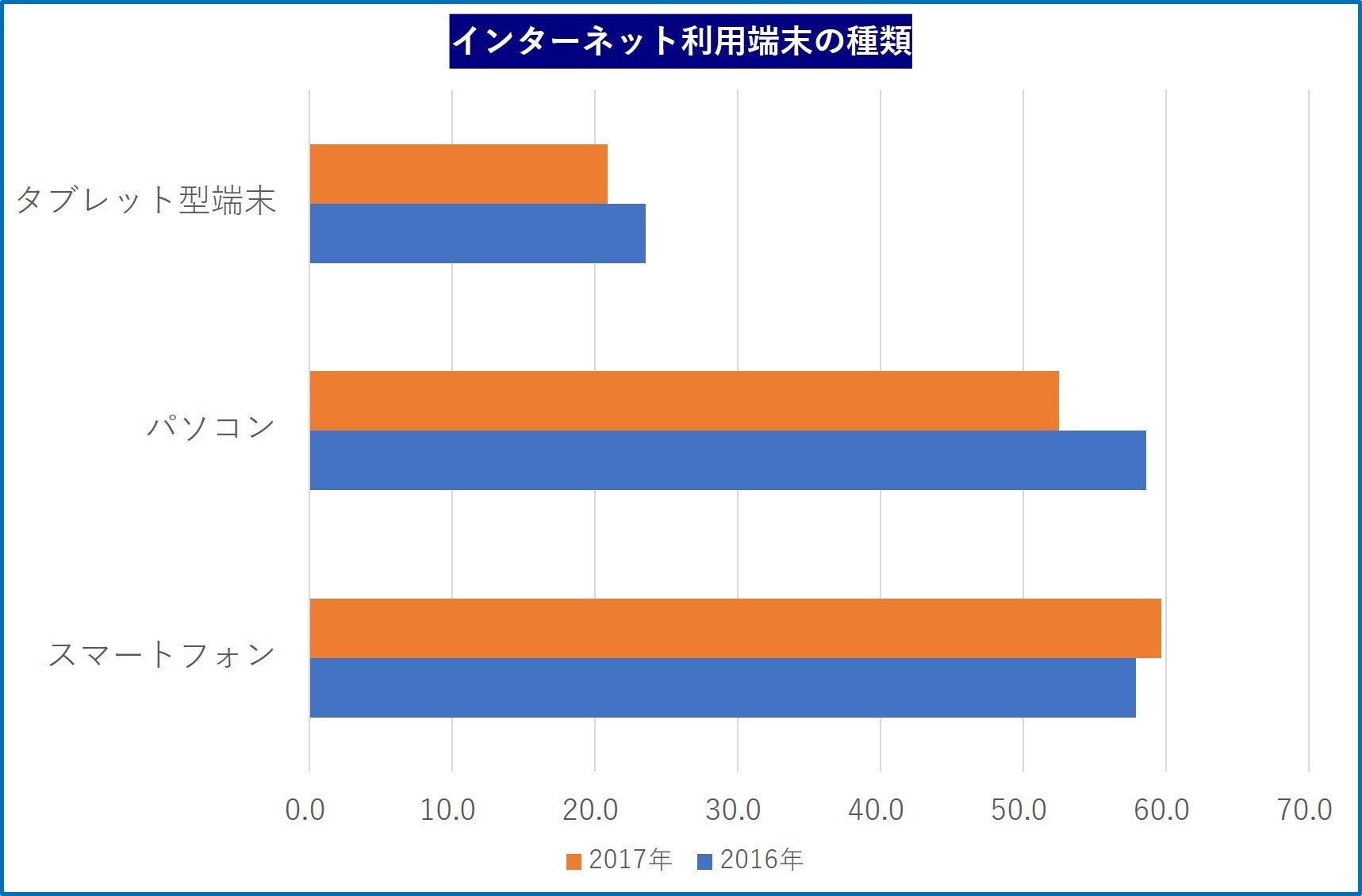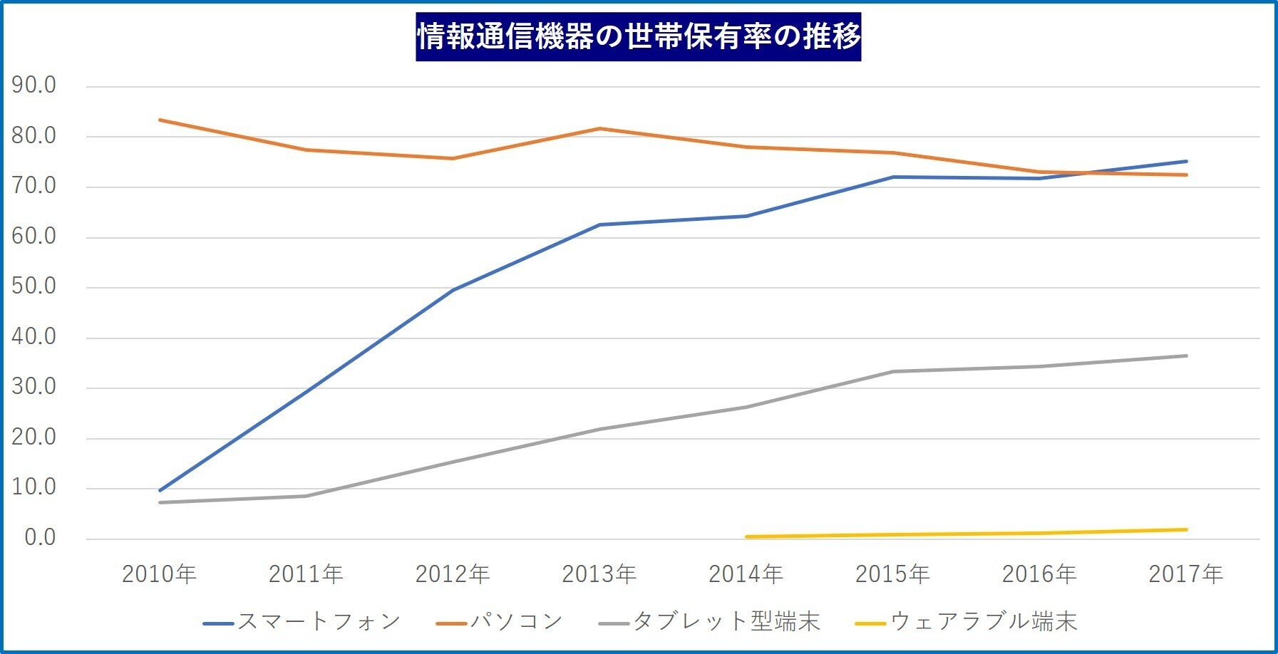 インターネット利用端末は、2017年にスマートフォンがパソコンを逆転。近年パソコンの世帯保有率も下がり続けている事に加え、今年の「5G」対応により、スマートフォン利用の割合は年々増加していく事が予想されます。