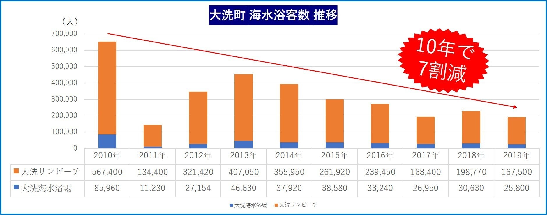 大洗町の海水浴客の入込客数は、10年前に比べ7割減という非常に厳しい状況です。町としても、「通年で楽しめる海でのアクティビティ」の開発に向けて動いていますが、海に頼らない形での町のアクティビティ開発の必要性を感じています。とはいえ、海水浴客がこれだけ減っているにも関わらず、観光客は横ばいをキープしており、それはそれで凄いことですね。