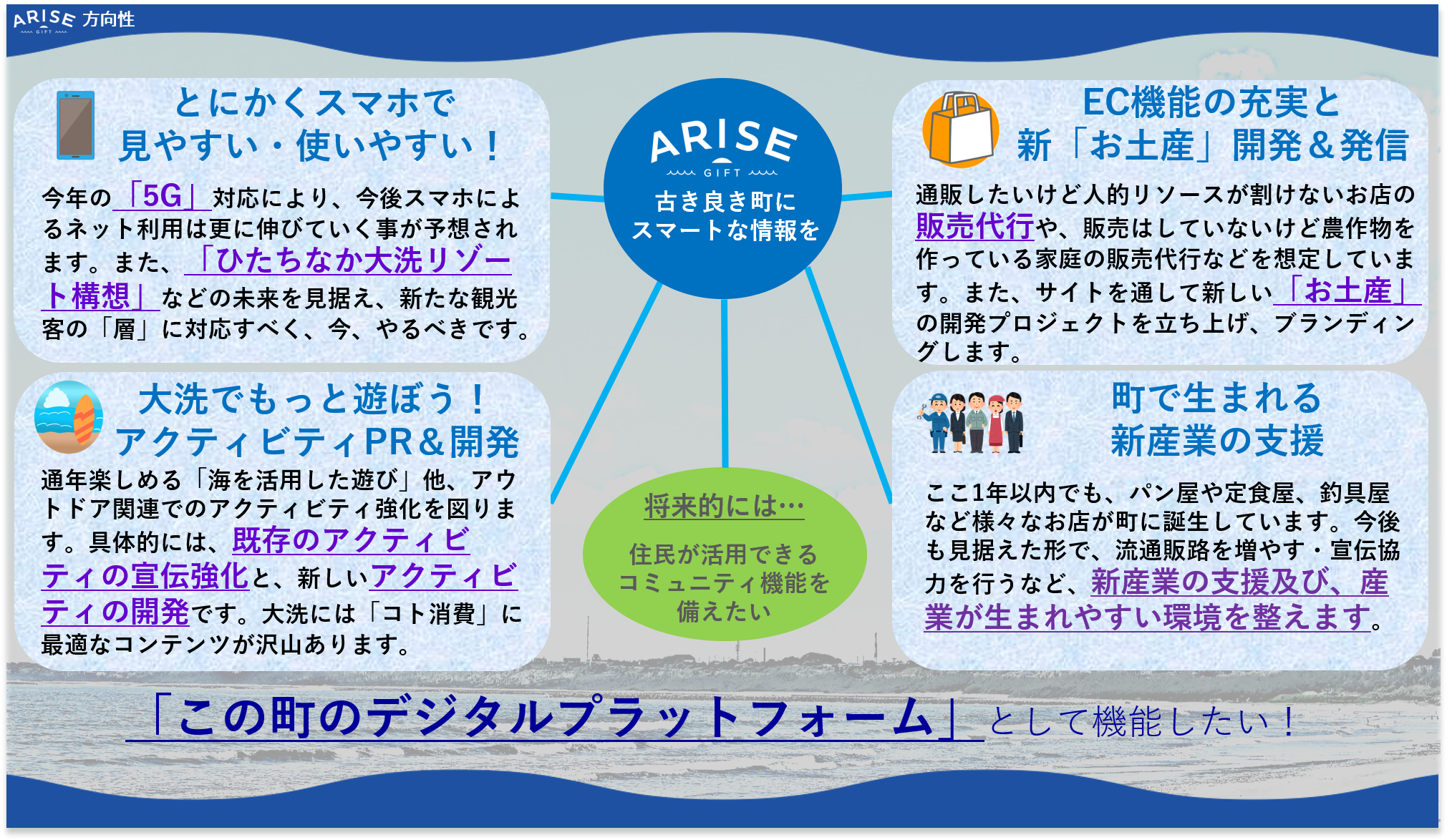 弊社の事情を説明すれば、元々は大洗で起業した後に町の産業のweb環境を整えつつ、弊社の体力を徐々に蓄えながら、「ARISE GIFT」をスモールスタートさせていく予定でした。しかしながら上記した町の「リソース不足」などの問題が顕在化し、すぐには対応出来ないという思いに至りました。とはいえ「このままで良い」とは思っておらず、観光が主軸の産業であるこの町に、なるべく早い段階でwebインフラを整える事が急務であると考えます。そこでまずは「ガワ」を作り、「是非このサイトに参加して頂けませんか」という形で、町の皆様になるべく負担が無い形で機能させたいと思っています。