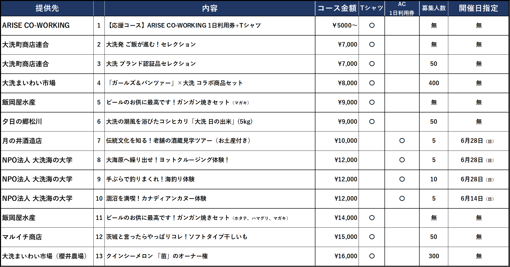 大洗の名店から特産品まで、様々なコースをご用意致しました!詳細は、画面右側のリターン品一覧をチェックしてみて下さいね。