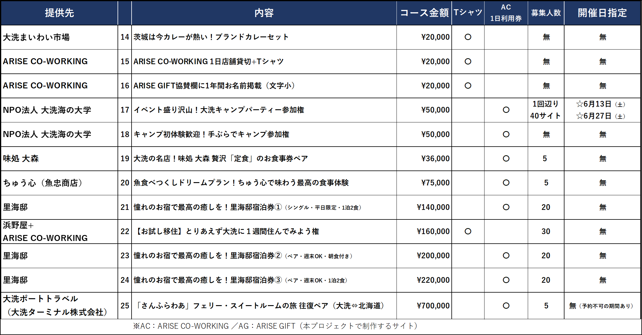 また、すべてのリターン品に、「メッセージTシャツ」か「ARISE CO-WORKING 1日利用券」が付属いたします。