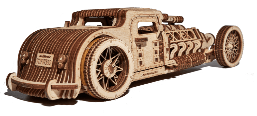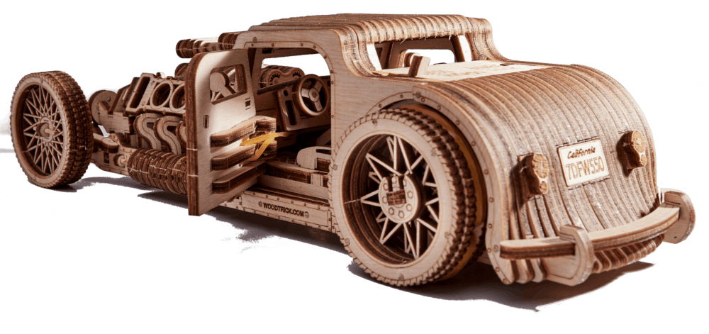今回、販売させて頂く新商品は2つ、1つ目はクールなロードスター、ホットロッドです!ホットロッドは1930年代に生まれたカスタムカーのジャンルで、当時はスピードを追い求める若者達の熱狂の的でした。むき出しのV8エンジンを積みタイヤから白煙を巻き上げて猛速度で走るホットロッド、ウッドトリックのこのマシンにあなたも熱狂してみませんか?