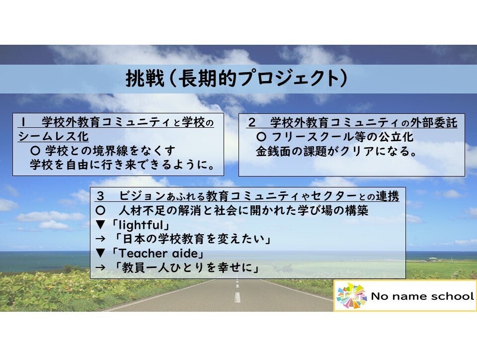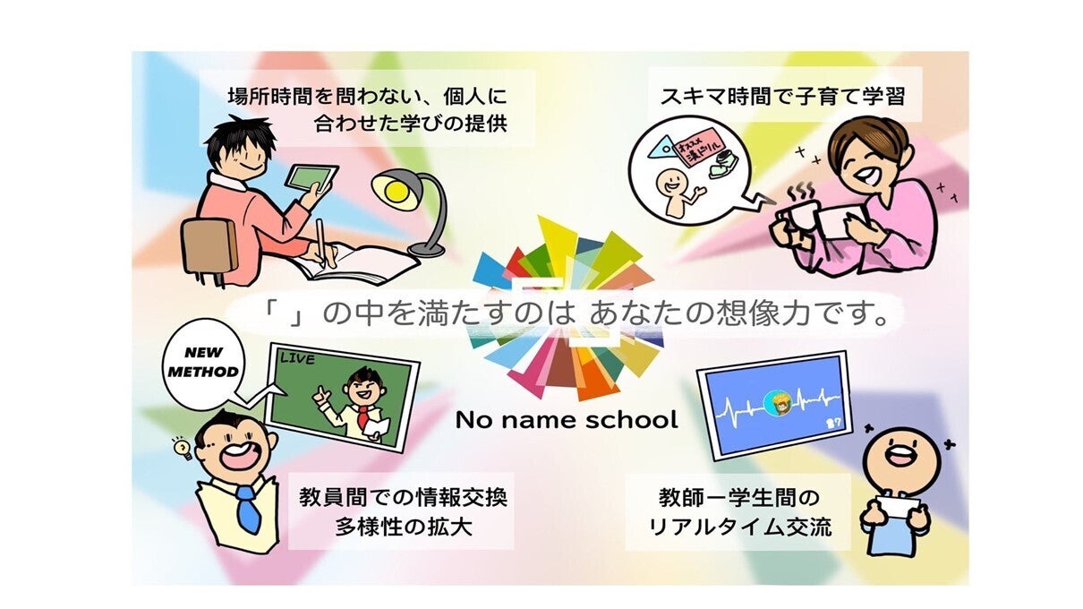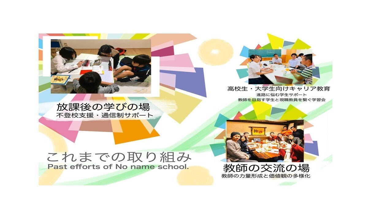 そこで、「 」No name schoolを設立することにより、様々なコミュニティやセクターの方々をつなぎ、地域の方の協力や外部リソースの活用できるような社会に開かれた学校現場を目指していきます。