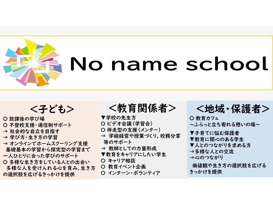 この度、「一人ひとりが自分らしく生きる道を応援し合える社会」の実現を目指し、「 」No name schoolを設立します。