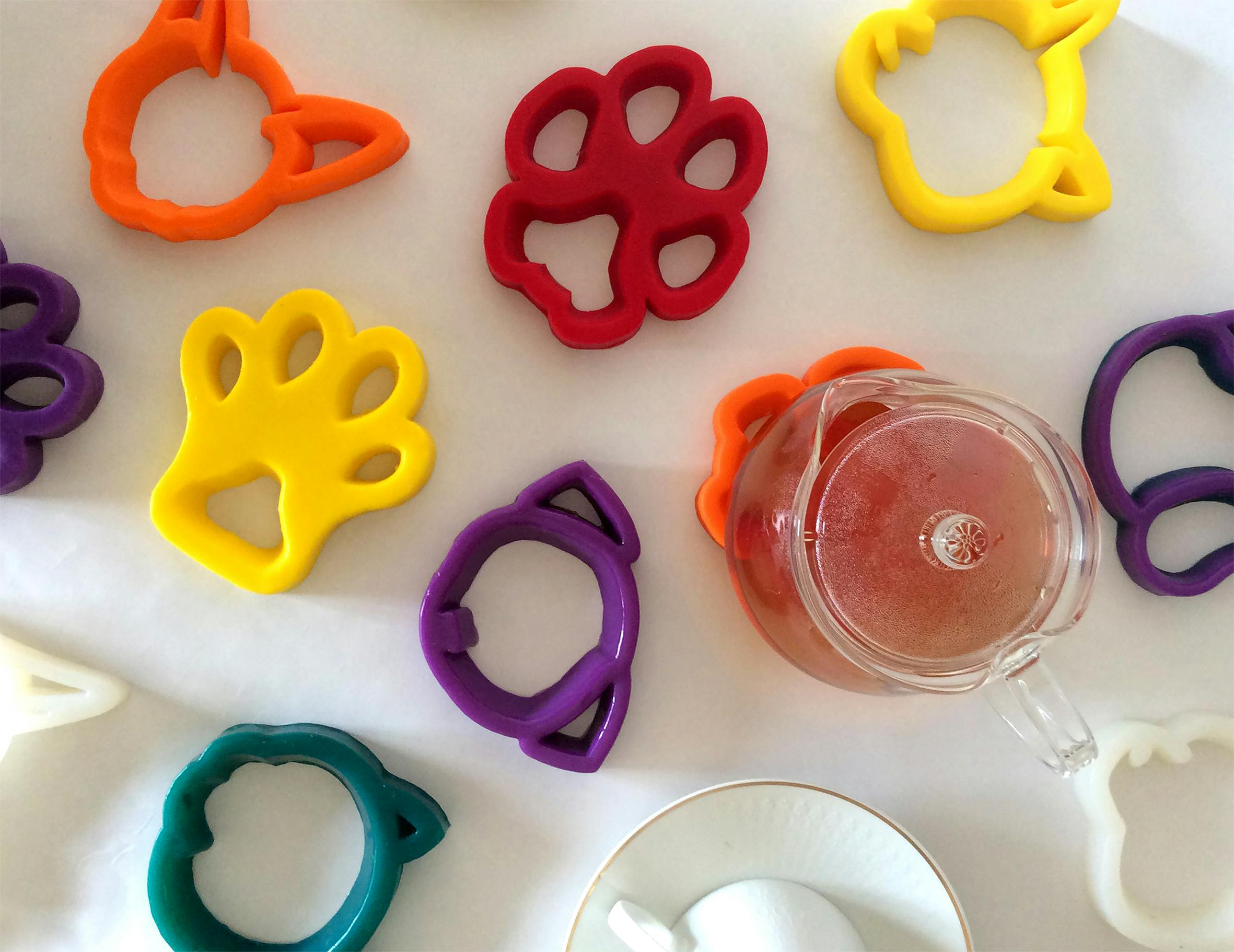 耐熱性があり柔らかなシリコンで出来ています。鋳物の鍋敷きを使っていて熱くて手を離した時に滑ってしまいヒヤッとしたことありませんか?これがアイディアの元です。犬の手、猫の手などをシリーズで製作しています。