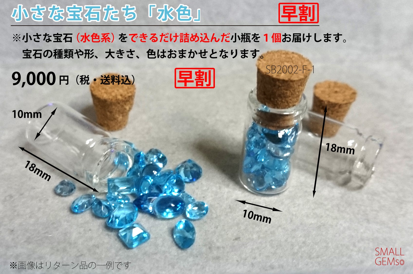 小瓶に詰め込む宝石それぞれの形や大きさによって、中に入っている小さな宝石たちの「数」はそれぞれの商品ごとに異なりますのでご了承ください。