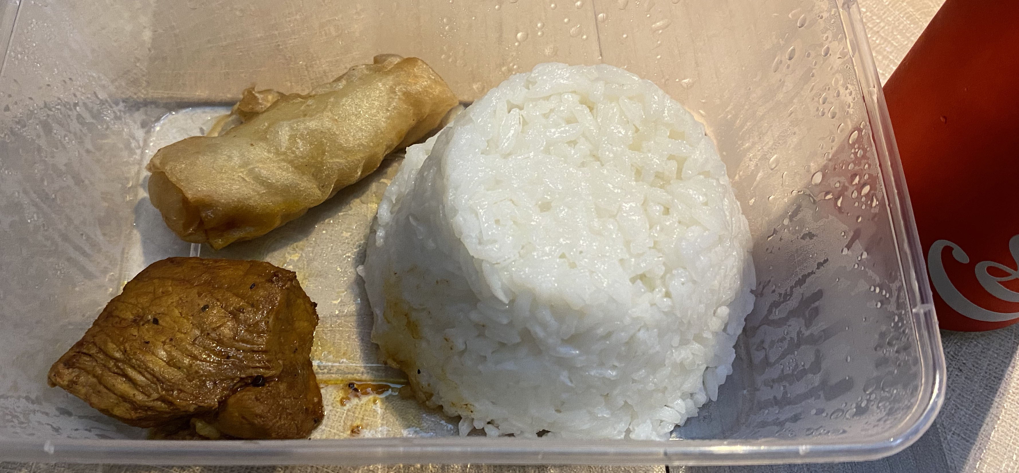 (フィリピンの典型的な食事。少しのお肉とごはん。野菜はなしで、コーラを合わせる。)