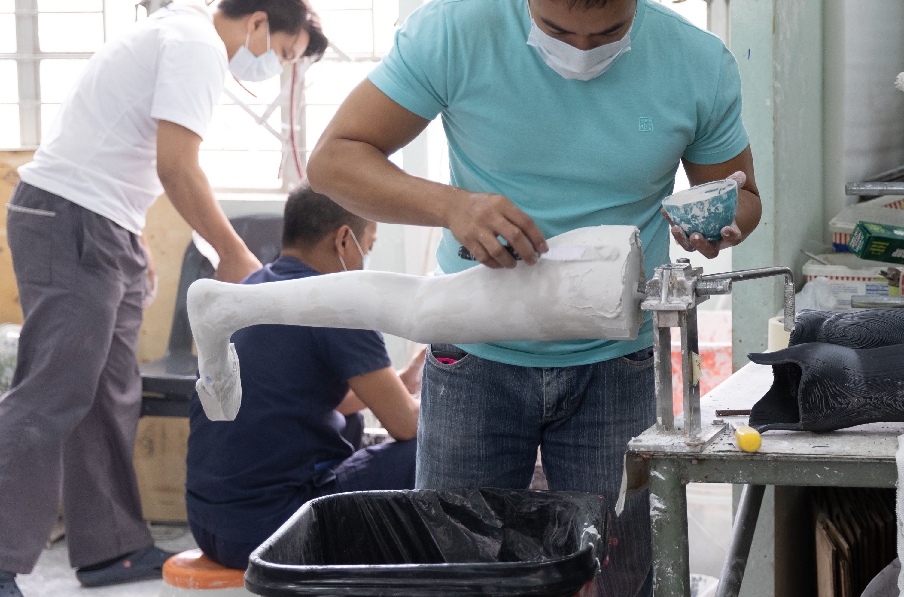 フィリピンの義足製造所は、わたし徳島の他には、義肢装具士、理学療法士、受付、営業、市役所担当、3Dプリンタオペレーター、会計などのメンバーで、現在月に20〜30名ほどの義足を生産しています。