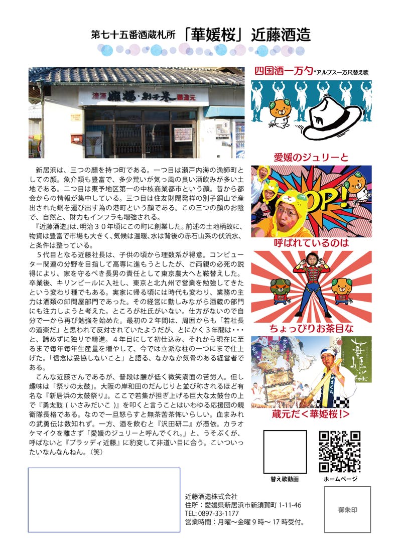 ①『四国酒蔵88箇所』のそれぞれの札場(酒蔵さん)の特徴を表現したユニークな歌詞を「アルプス一万尺」の替え歌「四国酒一万勺」(一万勺=100升)で