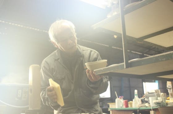 青木さんがロクロで挽いた茶碗を前に石膏型を作り始める型屋さん。