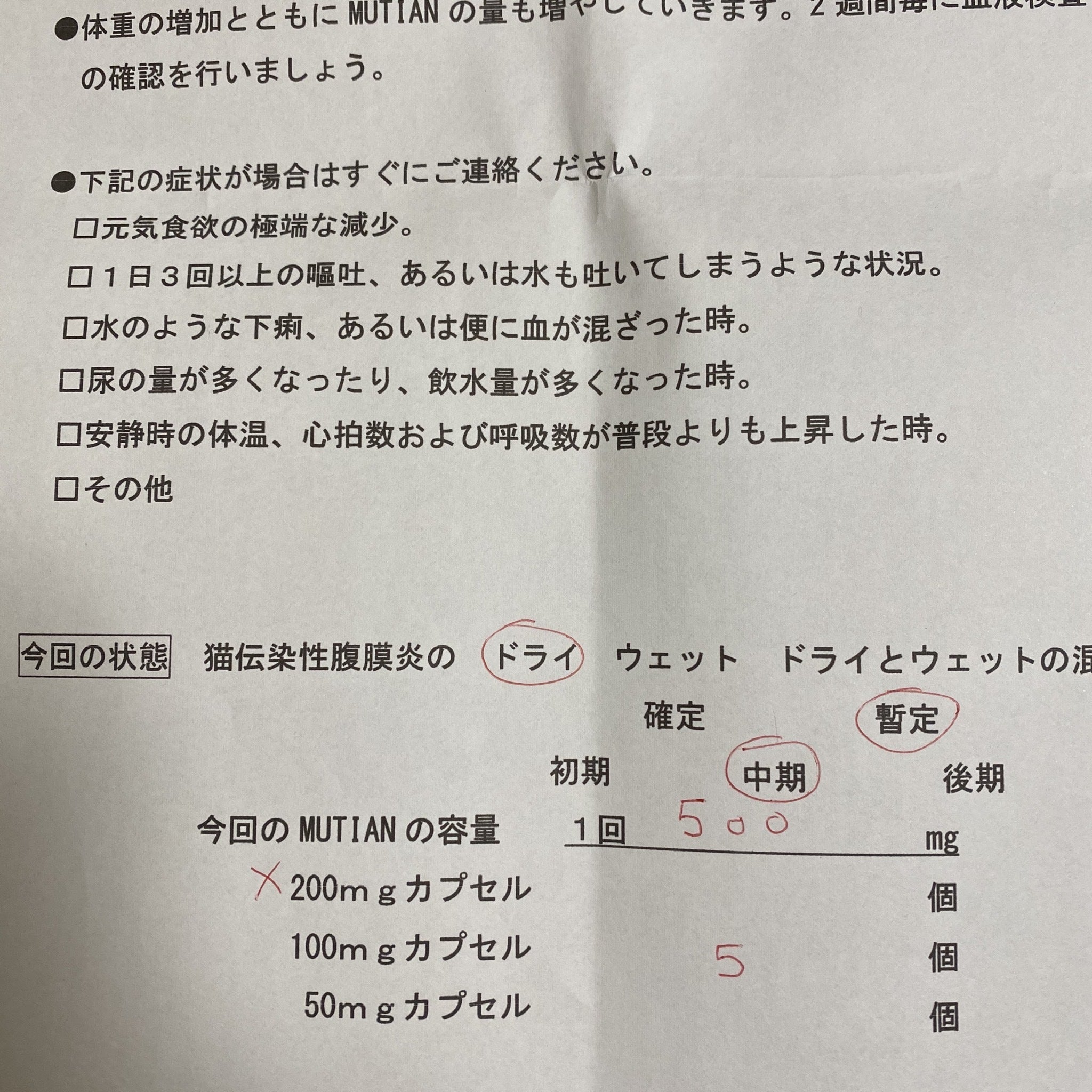 MUTIANは1週間分処方頂きました、効き目があればFIPとして判断して良いとの事で、投薬をして様子を見ます。