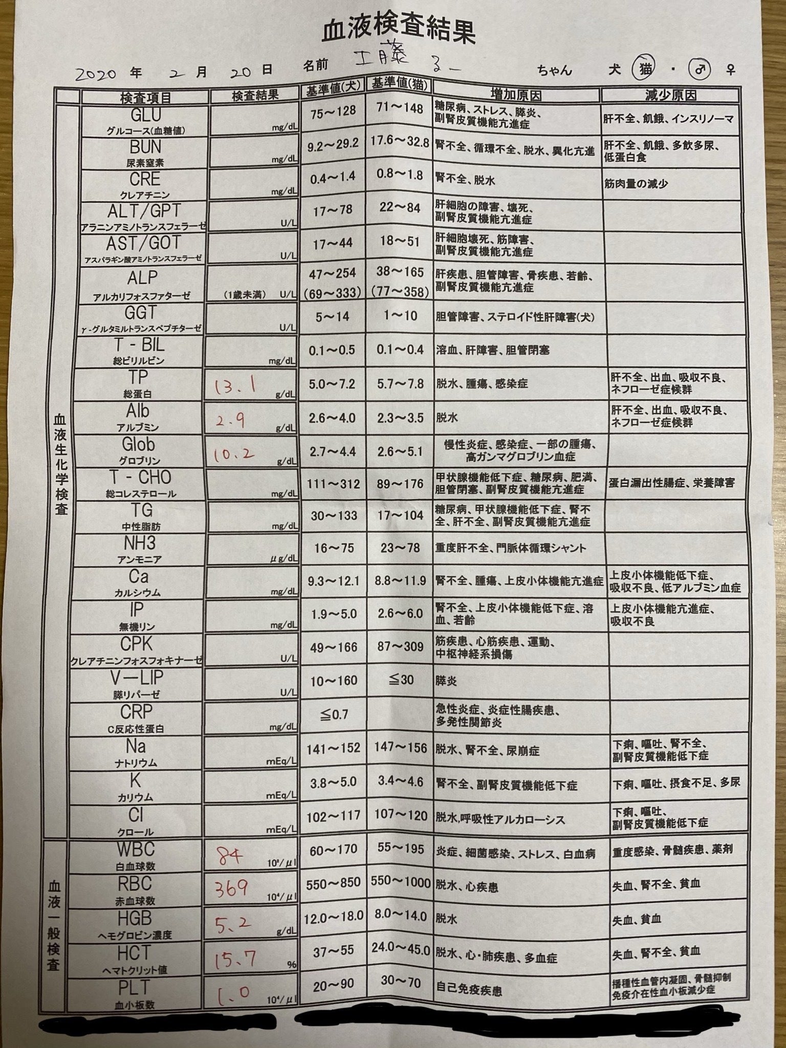 こちらは改めて行った血液検査の結果です。極度の貧血が出ていました。総蛋白の数値で見ても、エコーで内臓の状態を見ても、FIPドライタイプ中期として暫定診断を頂きました。