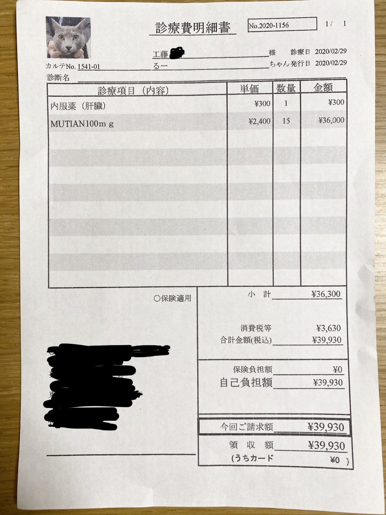 今回は獣医の判断で診察は無し、次回3月7日の通院時に行う事になりましたので、薬代のみの支払いとなります。
