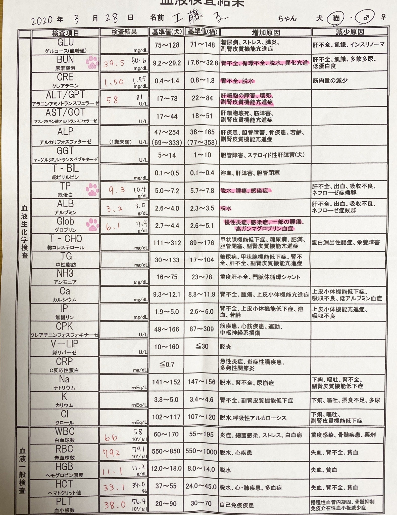 腎臓(BUN、CRE)の数値がかなり回復しています。赤字の隣の黒字は前回の数値です。