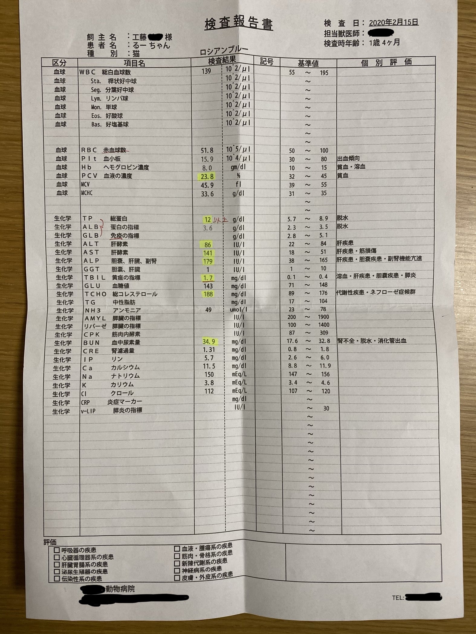 2020/05/10 13:49こんにちは、工藤です。5月9日(土)にMUTIAN協力院へ行きましたので、ご報告させて頂きます。投薬80日目、通院9回目となります。前回「A/G比→0.64」で0.6以上を超えるという目標はクリア、0.8以上だと更に安心です。院内で血液検査を行った結果です。赤枠内の「ALBアルブミン」と「Globグロブリン」を割り算出します。前回は0.64でしたが、今回は0.66です。わずかに改善されていますが、誤差の範囲の数値なので、外注での血液検査の結果を待ちたいです。BUN、CREなどの腎臓の数値は、MUTIANの投薬をやめると改善される事が多いそうなので様子見です。今回かかった費用になります。エコー検査を行ったところ、少し改善の様子が見られていました。本来、腎臓はつるんとした楕円形なのですが、るーくんの場合それがいびつな形になっていたのですが、その歪みが少し良くなっていました。84日間の投薬は、あと3日で終わりとなります。投薬開始の頃のるーくんは、弱々しく歩いていました。毛並みもボサボサ、脱水で目の瞬膜が出たまま、餌もチュールも食べない、ヨロヨロと動きが遅い、表情が暗い、そんな状態でした。3ヶ月前のるーくんの写真です。この頃を思い返すと、極端に元気がなく本当に可愛そうでした。MUTIANは金額が高いですが、効果は本当に凄いです。今朝のるーくんの写真です。元気になってくれて本当に良かった。皆様の支えのお陰で救われました。次回の通院が活動報告の最終となります。その際に、かかった費用の合計表も掲載させて頂く予定です。るーくんの日々の様子は、Twitterにてお届けさせて頂きます。次回は5月31日(日)に通院予定です。■スケジュール2月20日(木)初診(投薬開始)2月26日(水)通院2回目(FIP確定)2月29日(土)通院3回目(薬のみ処方)3月07日(土)通院4回目(腎臓数値悪化)3月14日(土)通院5回目(腎臓数値回復)3月28日(土)通院6回目(お薬増加)4月11日(土)通院7回目(外注の血液検査)4月25日(土)通院8回目(A/G比が低い)5月09日(土)通院9回目(外注の血液検査) :5月13日(水)投薬終了予定5月31日(日)通院10回目(経過観察)※活動報告終了 もっと見る【9】活動報告(通院8回目)