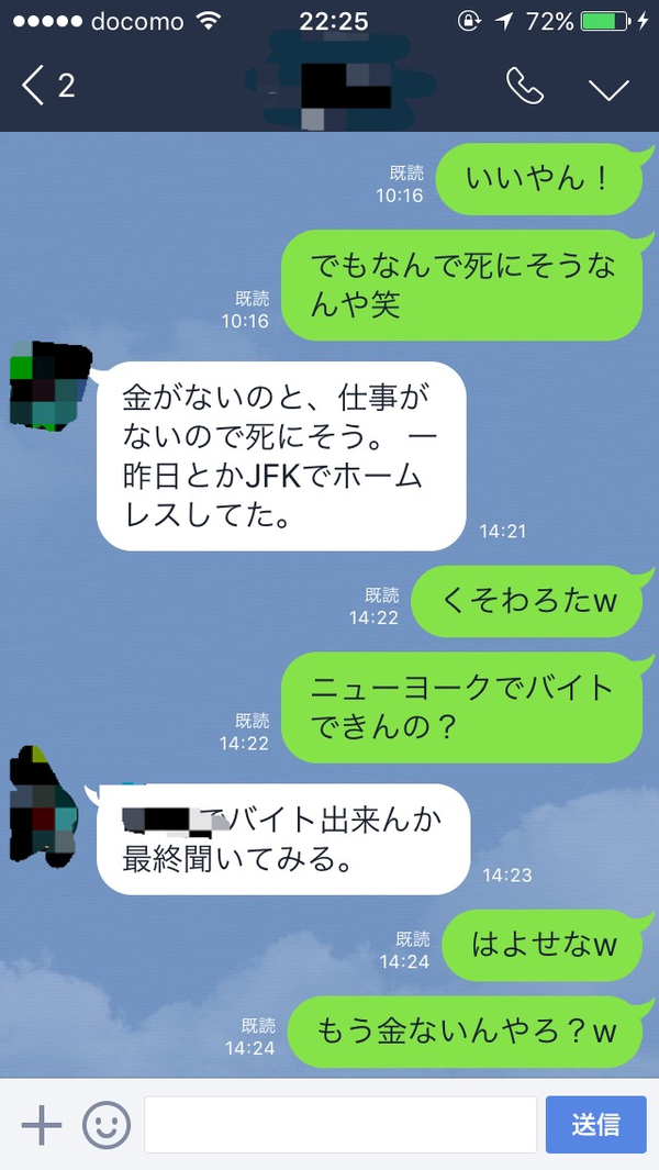 厳しい経済状況の中でニューヨークに一人でいる親友はなかなか改善されない現状に落ち込んでしまいついには「死にたい」というようになりました。