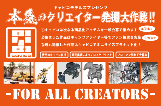 「何か新しいものを形にしたい!」「新しいものを生み出すクリエイターを応援したい!」そんな想いからキャビコの活動はスタートしました。そんな活動をより開かれたものにするため、今回私たちは新しい企画を立ち上げました。ホビーの世界に新しい風を起こしたい、そんな想いのある方は是非キャビコの活動を応援してください。そしてクリエイターの皆さん、キャビコと一緒に更なる高みを目指しましょう!!