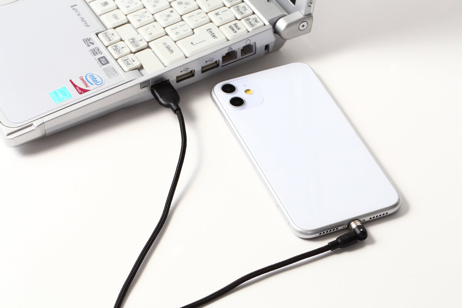 この充電ケーブルは、コネクタ部分を予め機器に装着しておき、充電する時はコードを近づけるだけでマグネットでカチッと接続され、充電が開始されます!