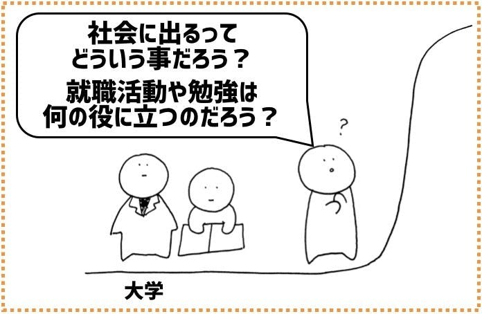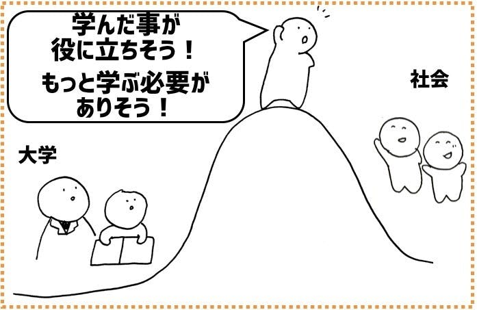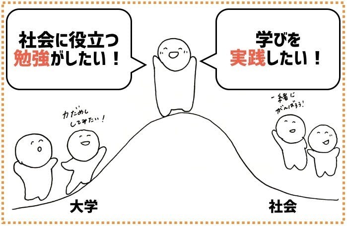 2人に1人が大学に進学する現在、「何となく大学に進学した」という大学生も少なくありません。そのまま過ごすと、将来の生き方や勉強することについて明確な自覚をもたずに4年間を過ごしてしまうことが危惧されます。 また、どんなに活躍したいという意志があったとしても、学ぶ環境と社会に隔たりがあることで、実際に社会に出たときとのギャップが生まれ、大学での学びを社会の中でうまく活かすことが出来ない状況が想定されるのです。