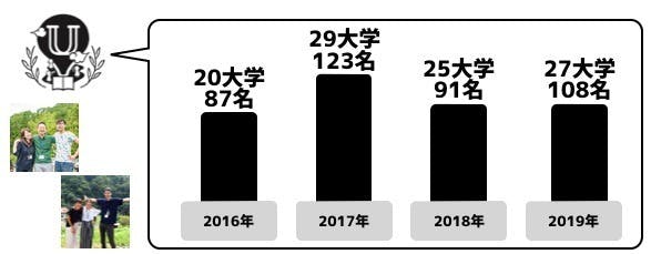 これまで、U.C.Cでは、市内の企業・NPO法人などへのインターンシップや、地域でのフィールドワークなどを行ってきました。その結果、全国67大学・約420名の大学生がU.C.Cでチャレンジしていきました。