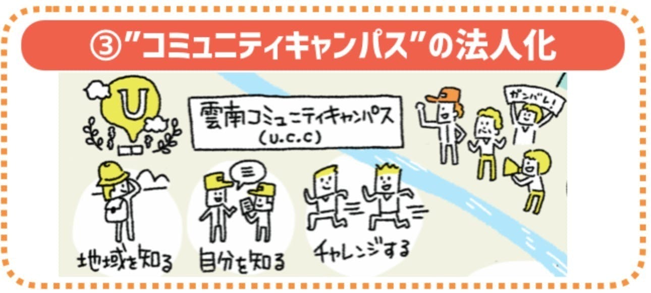 雲南市には高校は3高校ありますが、大学はありません。大学はありませんが、大学期間中に雲南市内だからこそ学べることが多くあります。日本の25年先を行く課題先進地だからこそ課題解決に取り組む人(先生)も多くいます。これから先、大学は学問を学ぶだけではなく、地域で実践していき、社会で即戦力となる人材を育成していくことが求められると考えています。まるで大学があるような活気あふれる「コミュニティキャンパス」は、これからの日本社会を担っていく「新しい大学のカタチ」になると感じています!