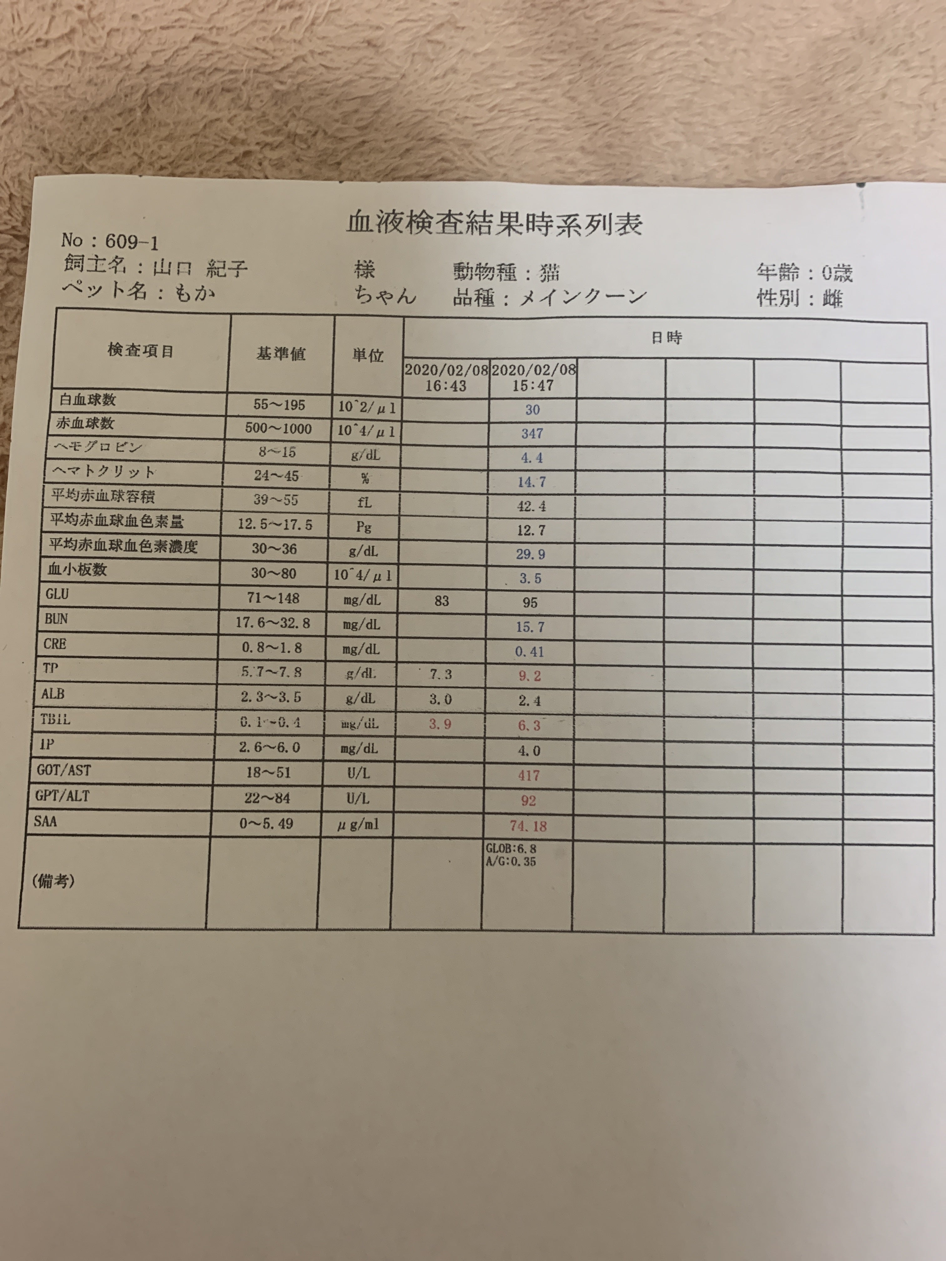 2020/06/04 15:34経過観察34日。経過観察1ヶ月目の血液検査に行ってきました。投薬中より食べる量が減り、ウエットを好みカリカリは気の向いた時に食べるという感じで運動量も多いので体重もそれほど伸びず…再発の兆候かなと不安になったりもしましたが腹部のエコーも全て問題なく、血液検査の結果ウイルスも検出されず。前回A/G0.76→0.84まで上がってました!最初の診断から協力病院に辿り着くまでに日数がかかってしまい投薬時点では末期だったので正直投薬治療中の再発も覚悟しての治療でした。まだ寛解まで2ヶ月、その後も完治という言葉はないので不安はありますがここまで頑張ってくれたモカに感謝です。それからモカは避妊手術をそろそろと考えていた矢先に発症してしまったので手術はできずにいるうちに発情期を迎えてしまい…。手術のストレスによる再発のリスクもありますが発情期のストレスや乳腺炎のリスクを考え次の発情期がくる前に避妊手術をする事になりました。今までは経過観察3ヶ月が過ぎてからの避妊、去勢手術が推奨されていたらしいのですが最近は去勢は投薬中から避妊は経過観察1ヶ月を過ぎたら行っても大丈夫となっているそうです。どちらにしても不安はありますが…今週末に日帰りでの手術の予約を入れてきたのでモカにはもう少し頑張っていただきます。最後までお読み頂きありがとうございました。 もっと見る