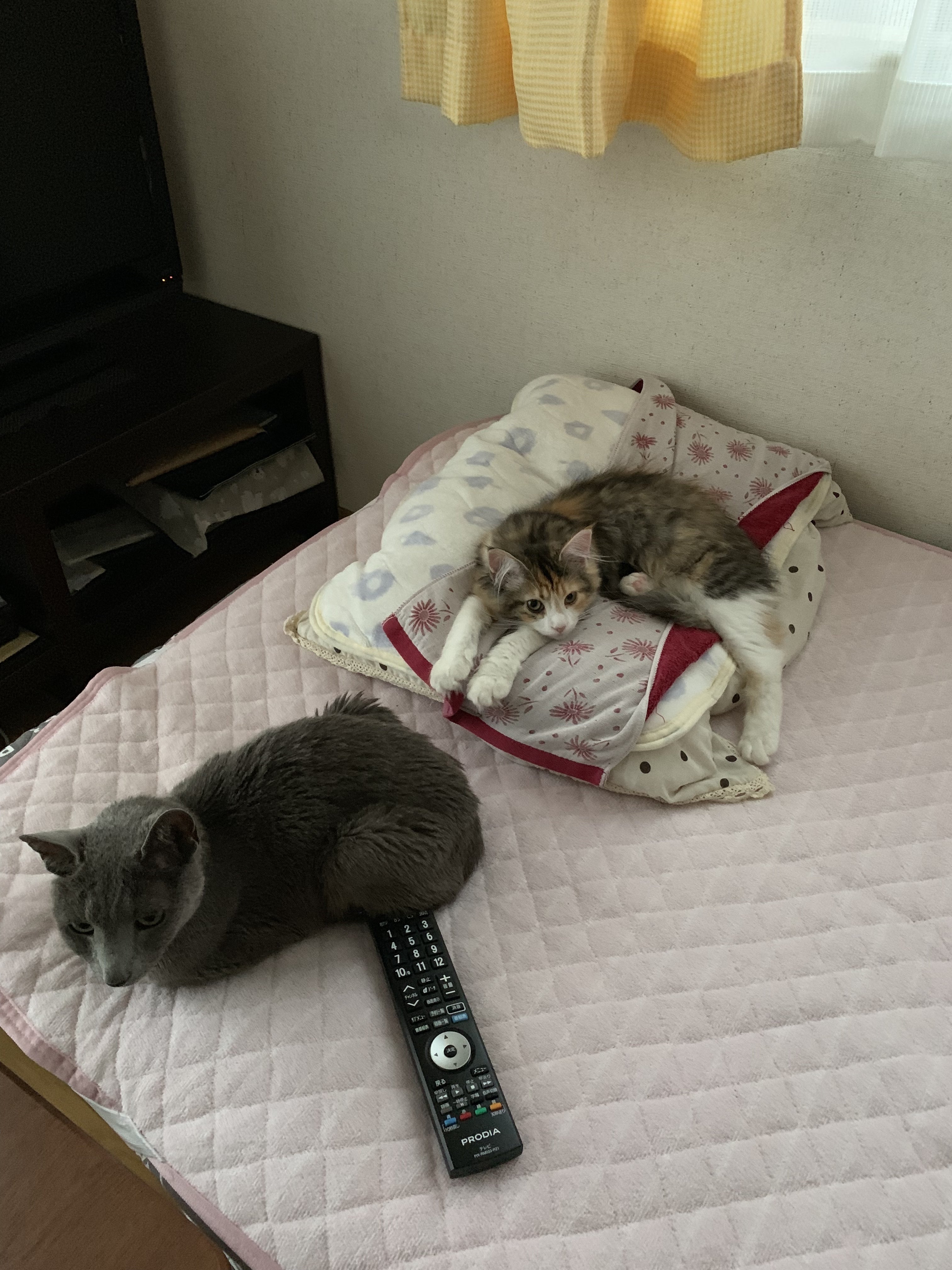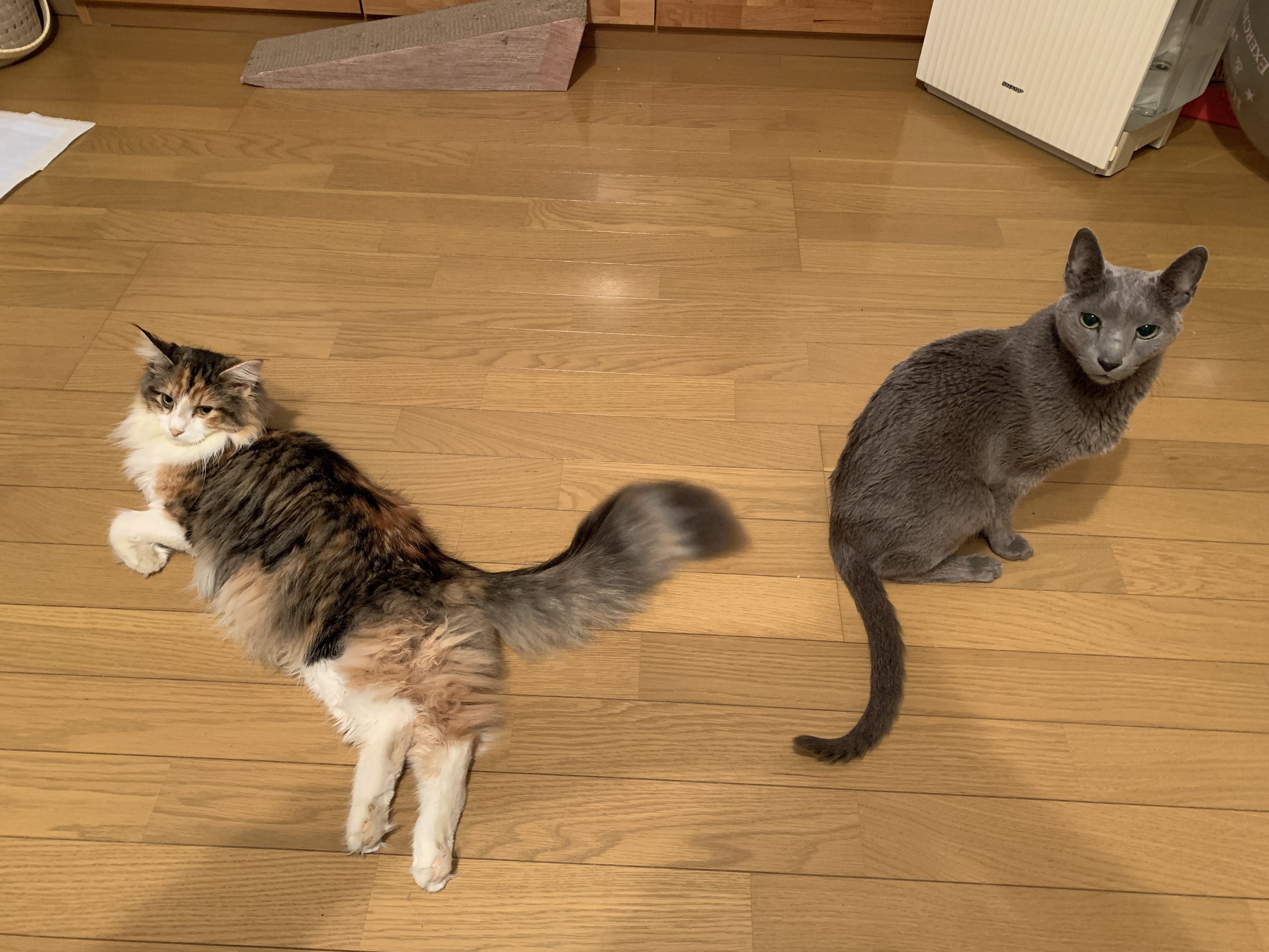 お兄ちゃん猫のロシアンブルーの♂12歳のバルは人見知り、猫見知りだったので仲良くできるか心配でしたがモカは怖がる事もせず自分から近寄って行き怒られてもめげません。