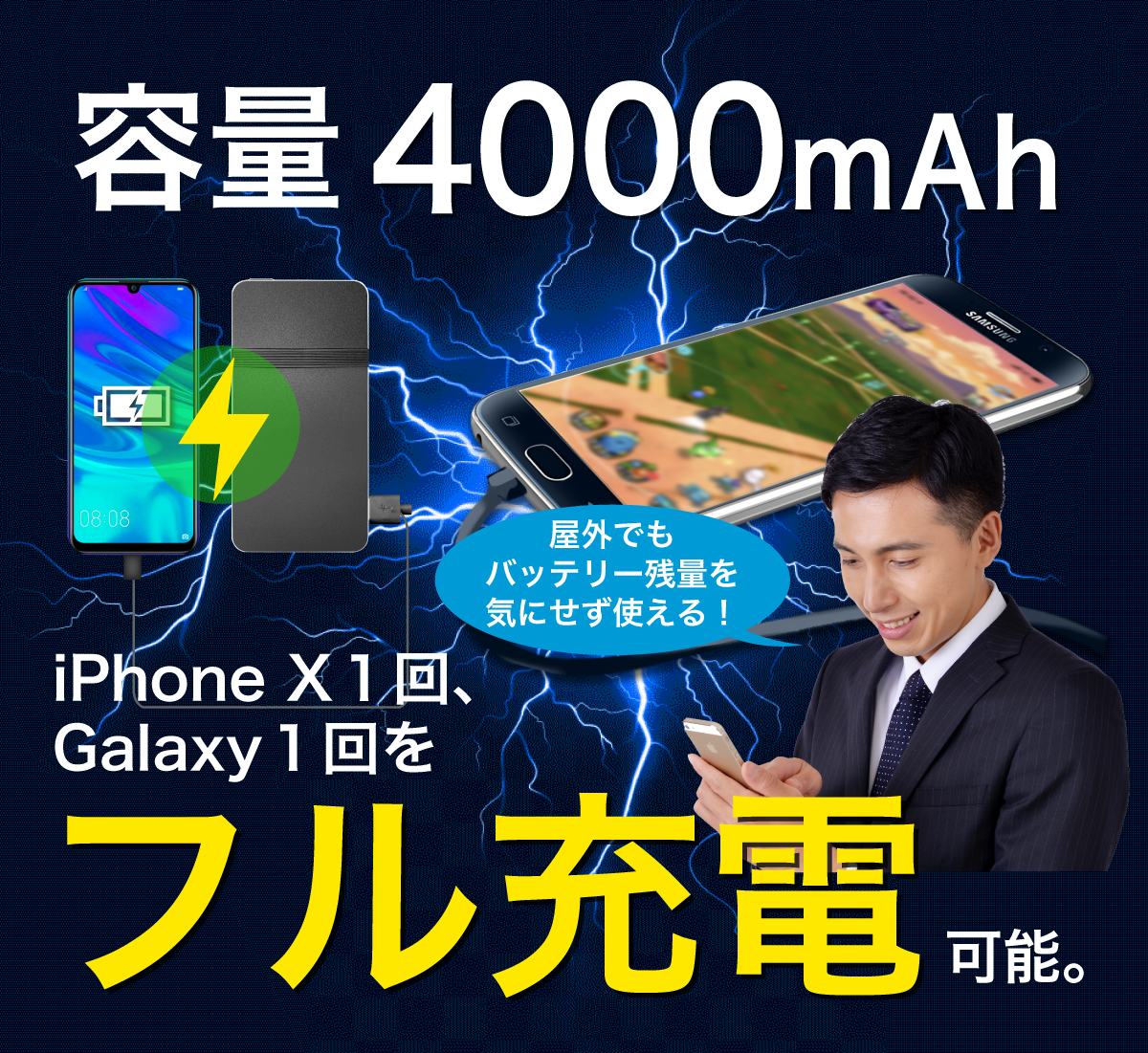 これはiPhoneX 1回、ギャラクシー 1回をフル充電できる量に相当するので、いざ1日で電池が切れそうになった時とても助かります。